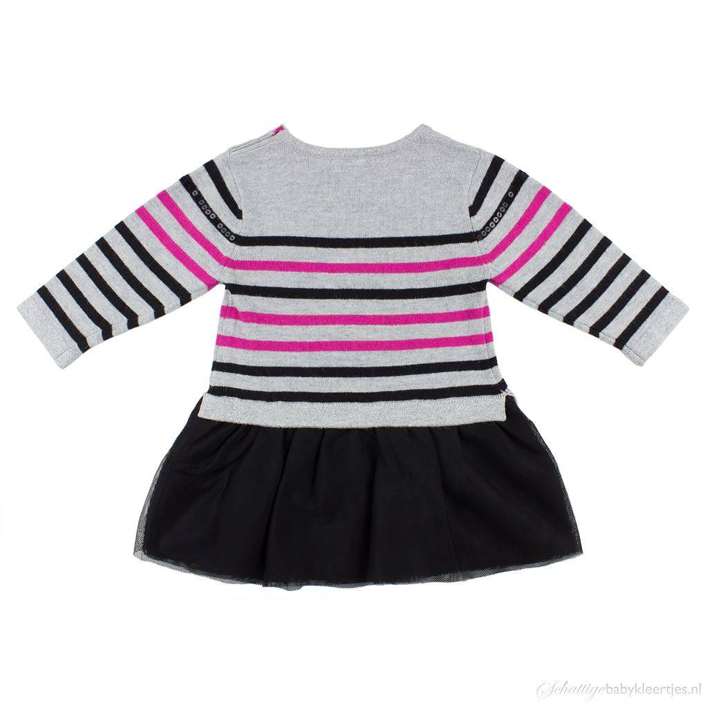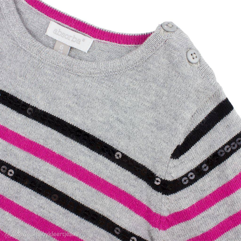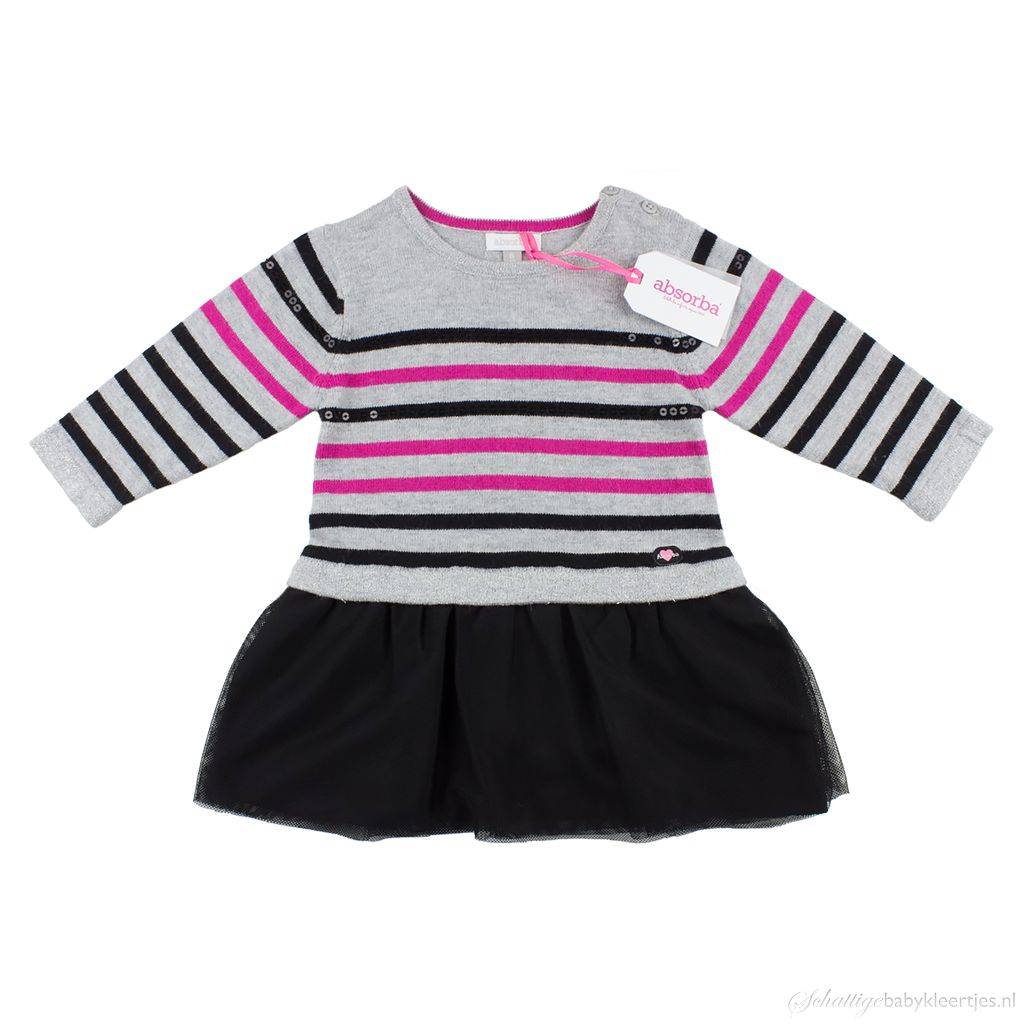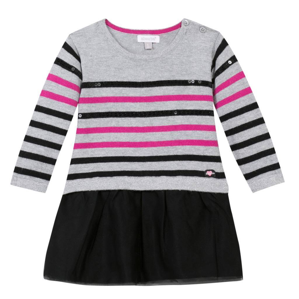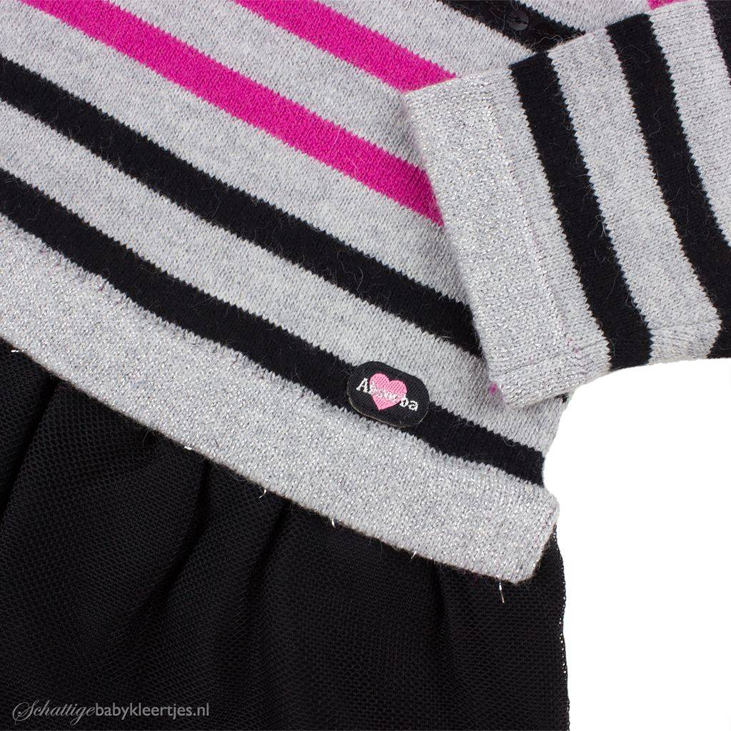 Franse topmerk Absorba. Het jurkje heeft een zilvergrijs gebreid lijfje met zwarte en fuchsia streepjes/ Op de bovenste twee zwarte streepjes zitten zwarte