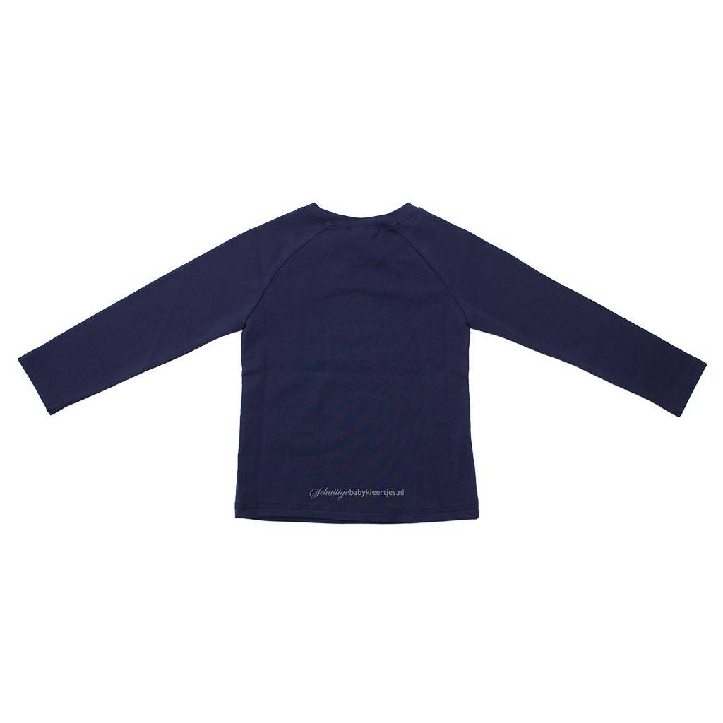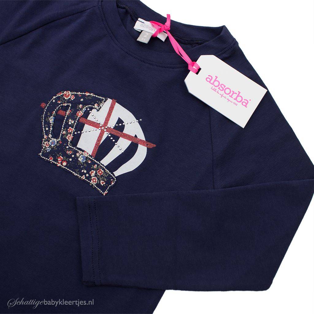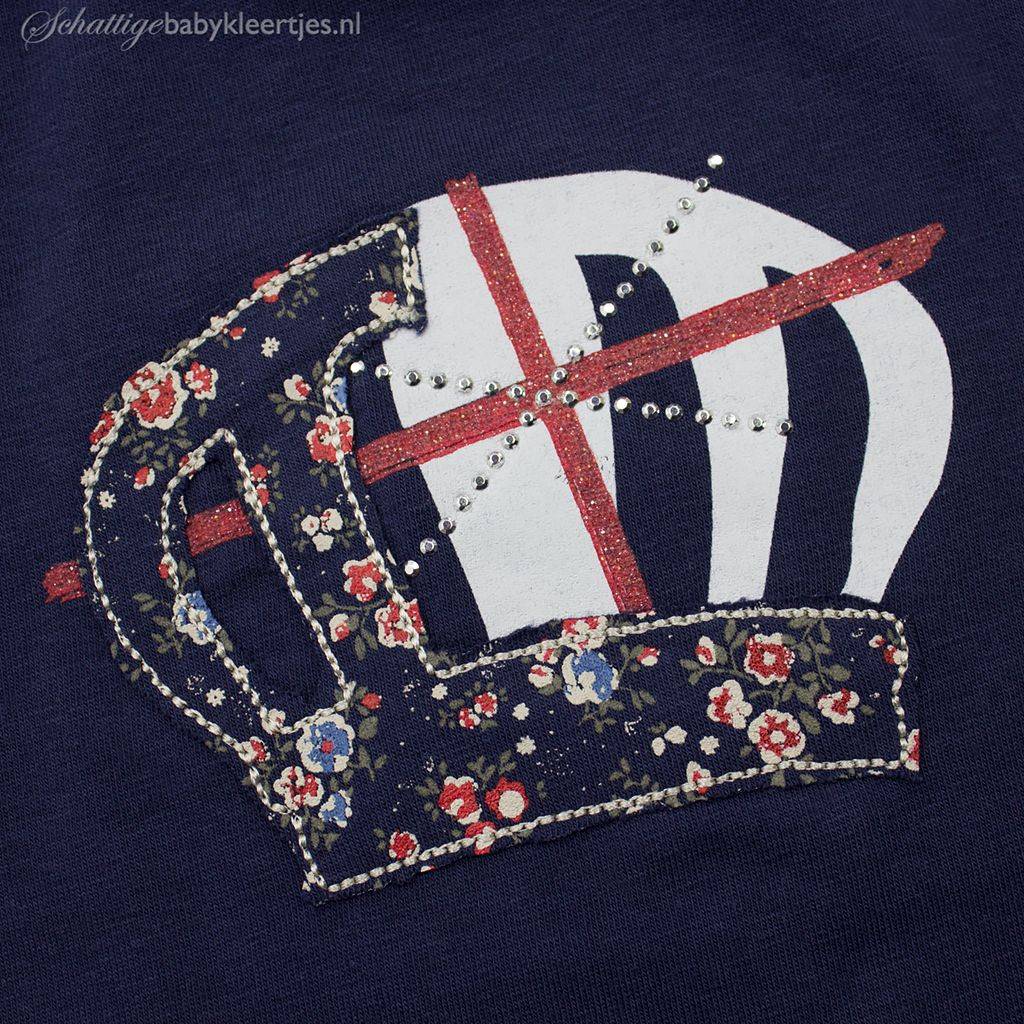 Op de borst zit een prachtige kroon, gemaakt van bloemtjes stof (linkerdeel), witte en rode print (rechterdeel) en twee rijen met kleine glittersteentjes. De mouwen en achterzijde van de longsleeve zijn effen donkerblauw.