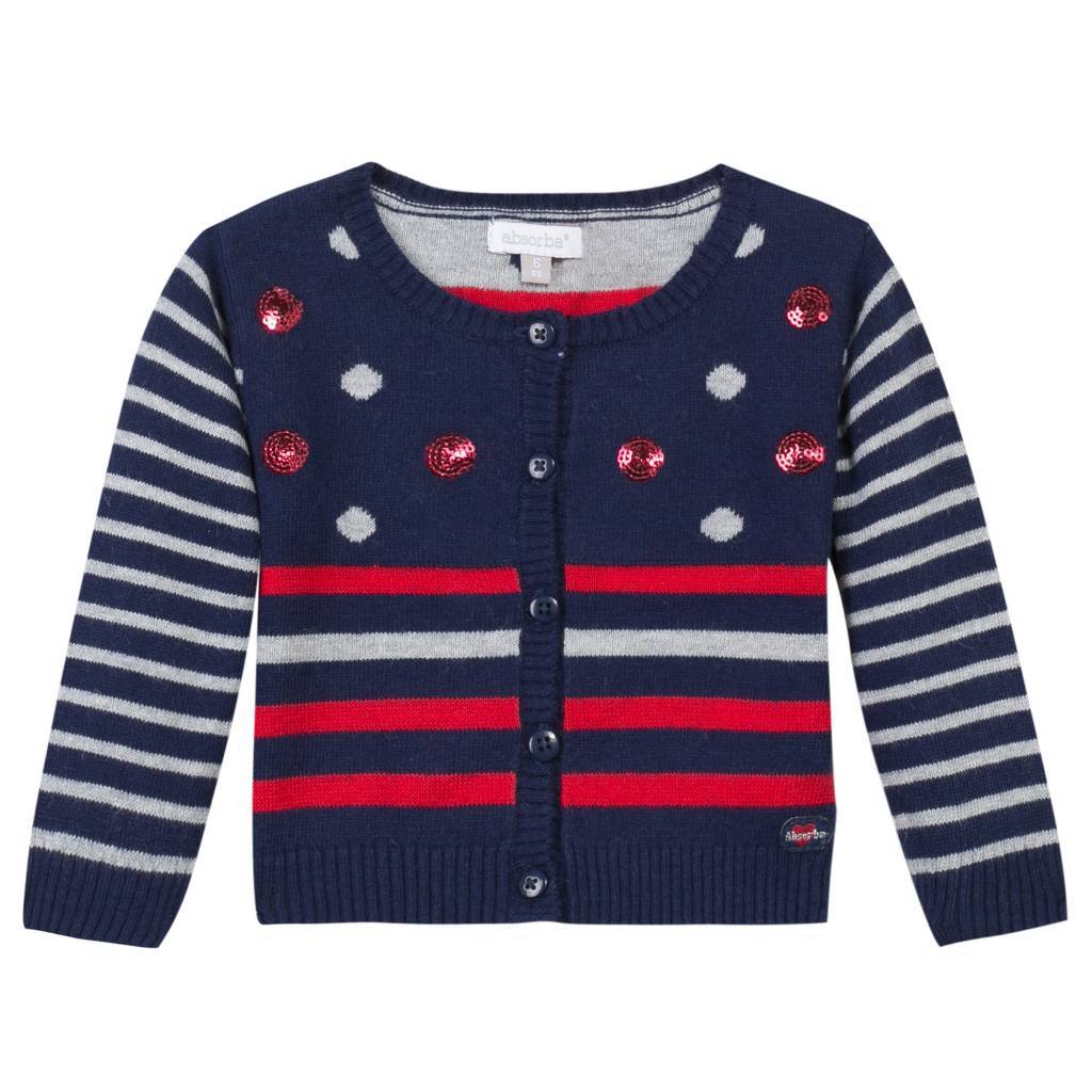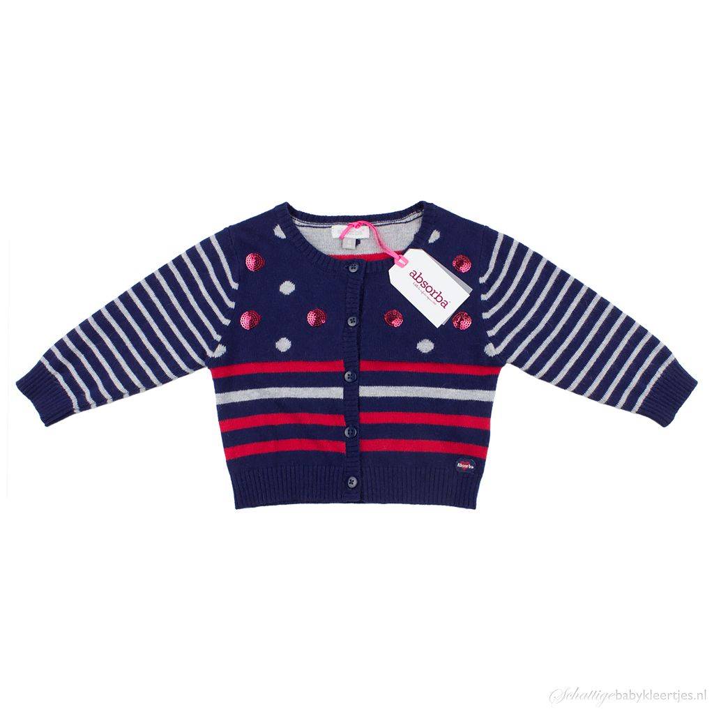 fijn gebreid en heeft een rond halsje waarlangs een geribbeld boordje loopt. Het vestje sluit met vijf donkerblauwe knoopjes, met eveneens een geribbeld boordje. Het elastische boordje komt terug aan de mouwen en de onderzijde van het vestje. Rechts op het boordje onderaan zit een donkerblauwe applicatie met een rood hartje en in zilverdraad "Absorba".
