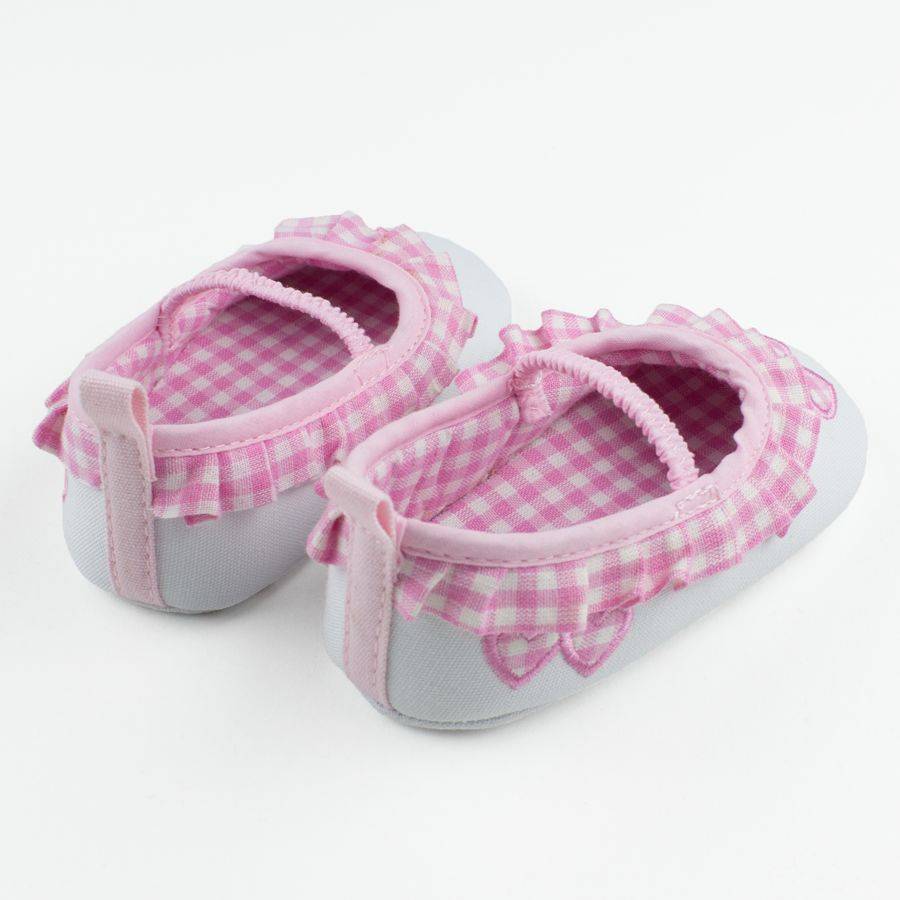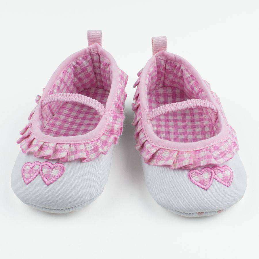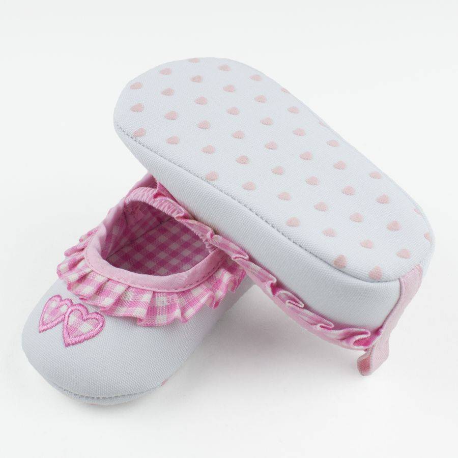 Opvallend lief ballerina schoentje voor uw baby dochter. Het schoentje is wit met een lichtroze/wit geruit rouche langs de rand. Het randje, het elastische bandje over de wreef en het lipje op de hiel is lichtroze. Op de neus van het schoentje zitten twee hartjes met hetzelfde witte/lichtroze ruitje. Ook aan de zijkant van het schoentje (buitenkant) komen deze twee hartjes terug. Om de hartjes zit lichtroze draad. Op de witte zool zitten nopjes in de vorm van lichtroze hartjes. Wanneer uw dochtertje al loopt, dan zal ze hierdoor steviger op haar beentjes blijven staan.