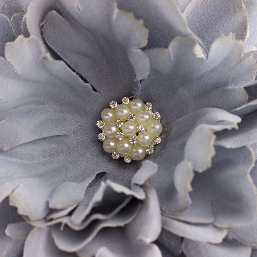 - De grijze pioenroos is 11 cm in diameter en heeft een schitterend hart van parels en strass. De bloem bestaat uit verschillende lagen bloemblaadjes en is levensecht.