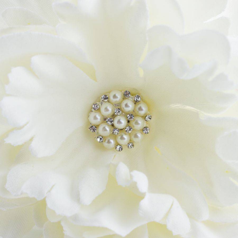 - De ivoorkleurige pioenroos is 11 cm in diameter en heeft een schitterend hart van parels en strass. De bloem bestaat uit verschillende lagen bloemblaadjes en is levensecht.
