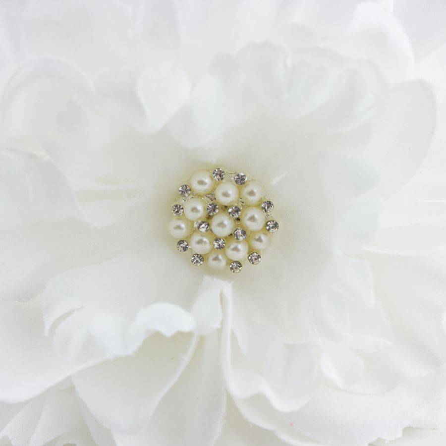 - De witte pioenroos is 11 cm in diameter en heeft een schitterend hart van parels en strass. De bloem bestaat uit verschillende lagen bloemblaadjes en is levensecht.