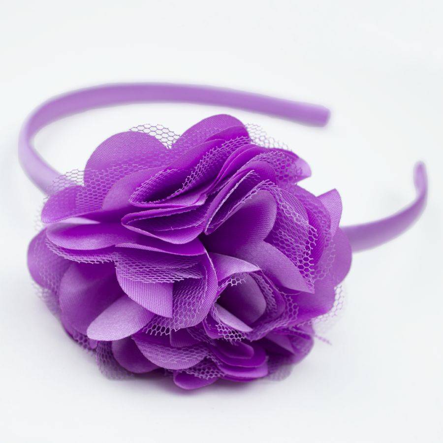 - Lieve, paarse diadeem met een grote rozet erop in paars satijn en tule. De diadeem zelf is ook gedekt met satijn.