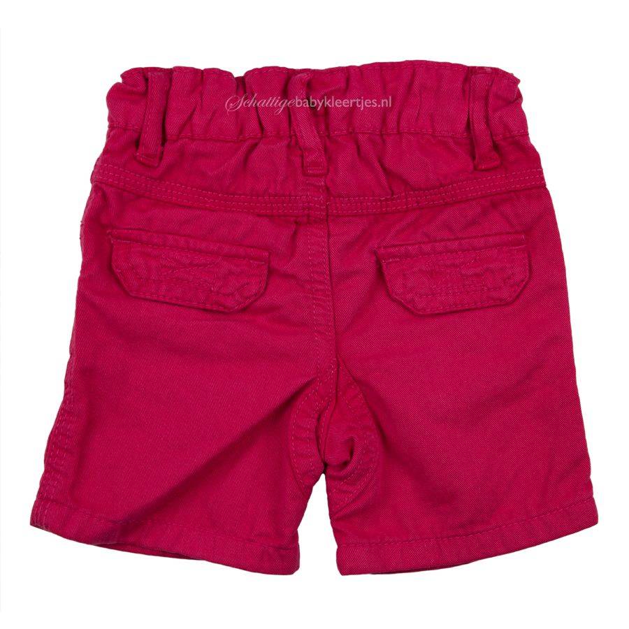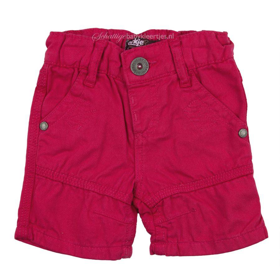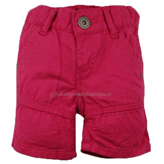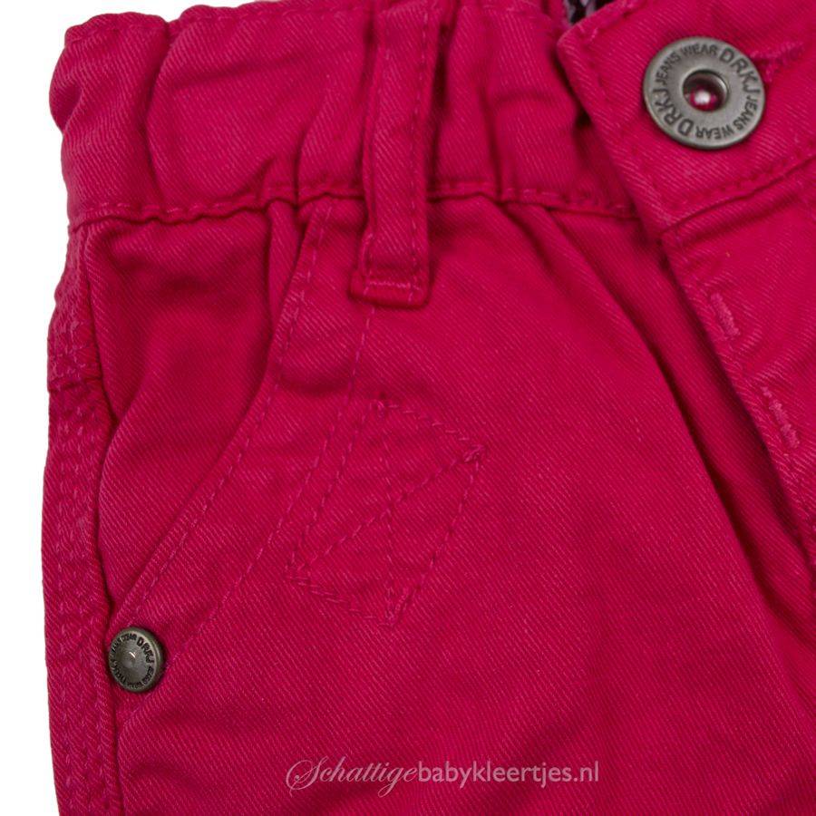 Stoere gekleurde bermuda van Dirkje. De kleur van deze broek is hardroze. Het broekje heeft een stoere, schuine naad en steekzakjes. Op de tailleband zitten vijf lussen voor een riem. Het broekje sluit met een metalen knop met "Jeanswear Drkj" erop; de ritssluiting is nep. Op de achterkant zitten twee kleppen, maar zonder zakken. Op het kontje zit ook ronde, extra naden.