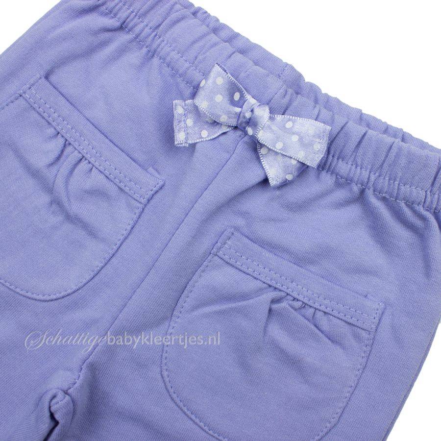Zacht jogging broekje van Dirkje uit de collectie Fabulous in mooi lila. Het broekje heeft een lekker boordje in de taille met daarop een lila, satijnen strikje met witte stippeltjes. Op de voorkant zitten twee ronde steekzakjes met een net boordje waaronder schattige plooitjes zitten. Het broekje loopt iets taps toe naar de broekspijpjes die voorzien zijn van elastiek. U kunt dit broekje combineren met het bijpassende vest en de verschillende shirts uit dezelfde collectie.