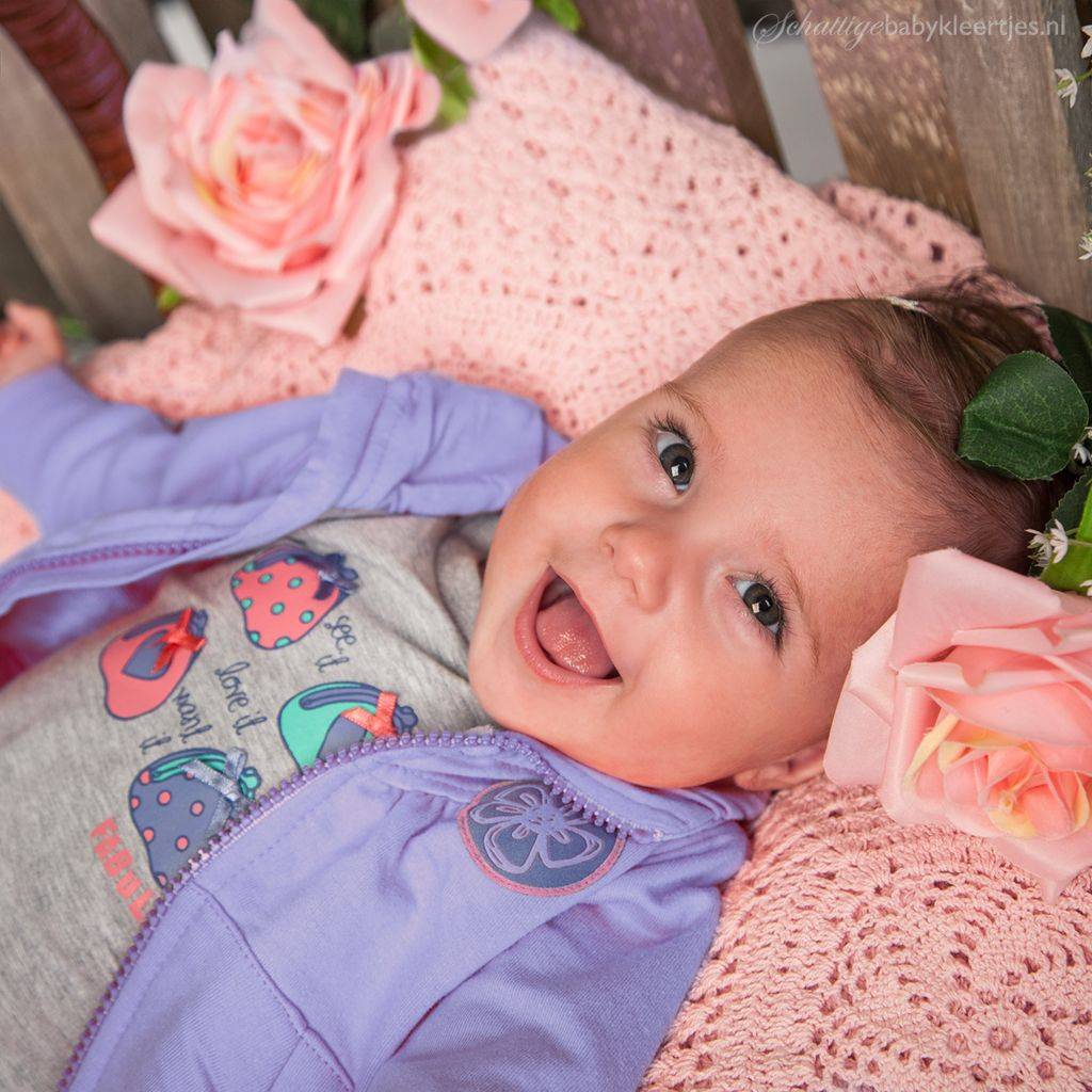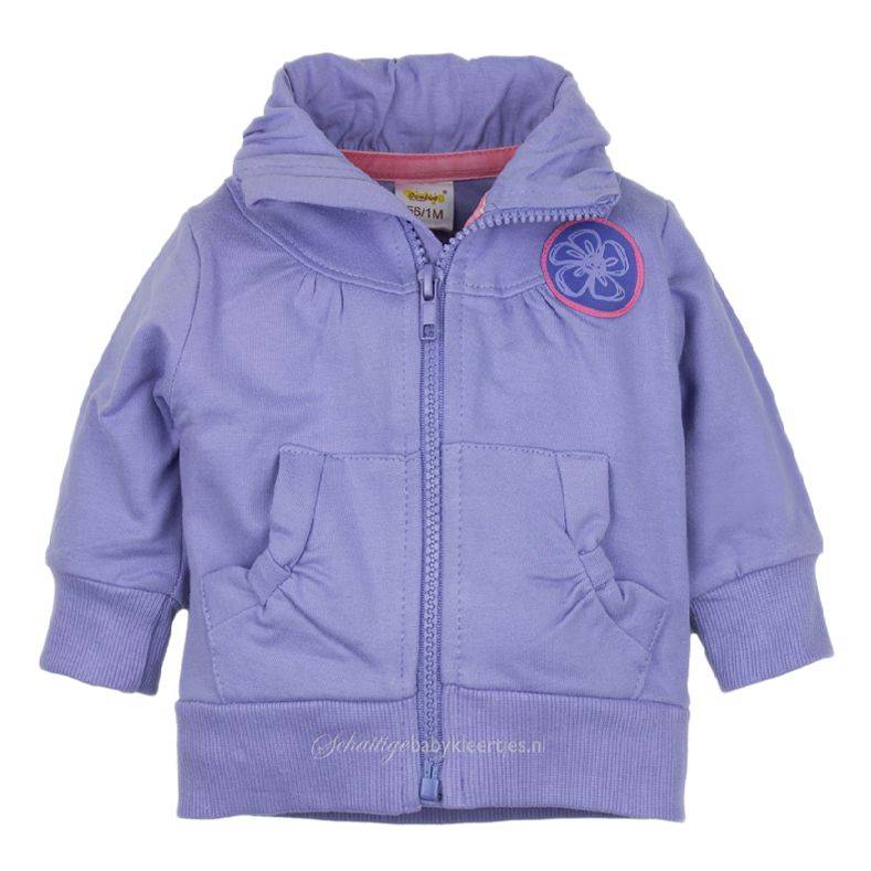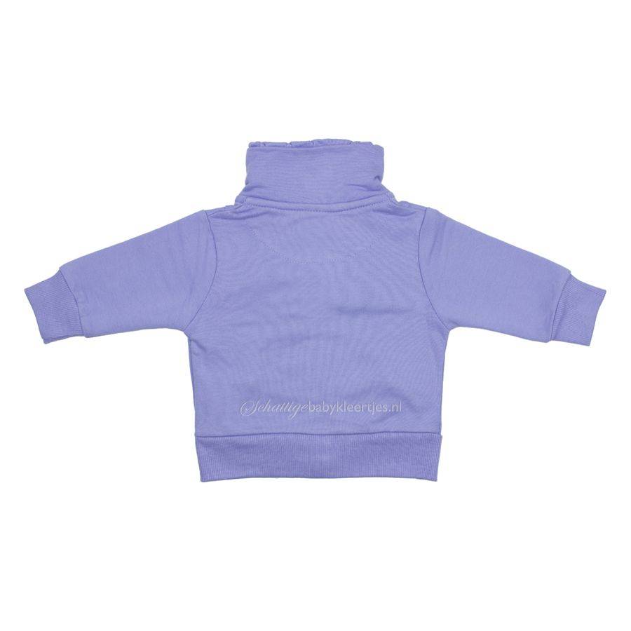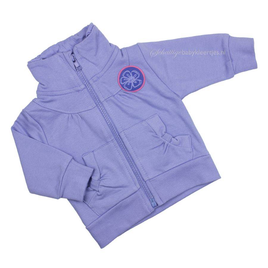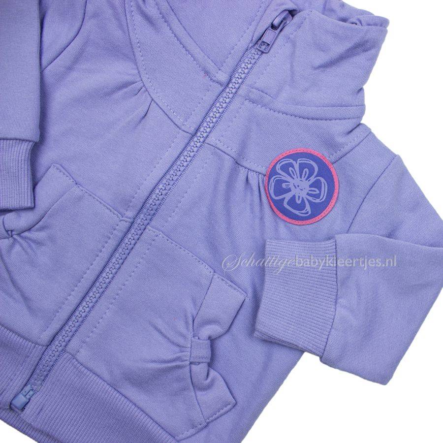 Zacht jogging vestje van Dirkje uit de collectie Fabulous in mooi lila. Het vest heeft een schattig kraagje dat is aangerimpeld. Er loopt een ronde naad van de ene naar de andere schouder over de borst. Daaronder zitten mooie plooitjes. Rechts op de borst zit een ronde lila applicatie met een roze bloem erop. Er zitten twee schuine steekzakken op het vest die - wanneer het vest gesloten is - op een buidelzak lijken. Halverwege het boordje van het zakje zit een bandje, waardoor er plooien ontstaan over het zakje heen. De mouwen en onderzijde van het vest zijn voorzien van een geribbeld boord. De mouwen en achterkant is effen. Het vest sluit met een lila rits.