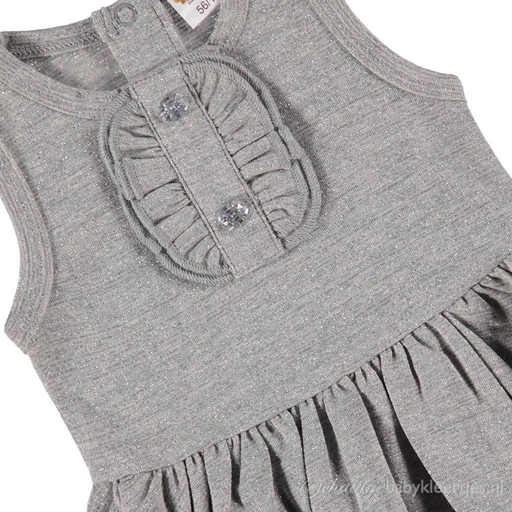 Het jurkje is grijs met een prachtig zilveren draadje ingeweven, wat het jurkje een feestelijke look geeft. Het draagt comfortabel, gemaakt van dunne elastische stof. Perfect voor de zomer! Het mouwloze jurkje heeft gladde boordjes aan de hals en de armsgaten. Op de borst zitten twee ovalen glazen knoopjes op twee lagen rouches. Het jurkje sluit met twee drukknoopjes op de rug. Op de heupen loopt een siernaad waar het rokdeel start. Onder de naad is de rok geplooid en waaiert wijd uit. Een echt feestjurkje dus!