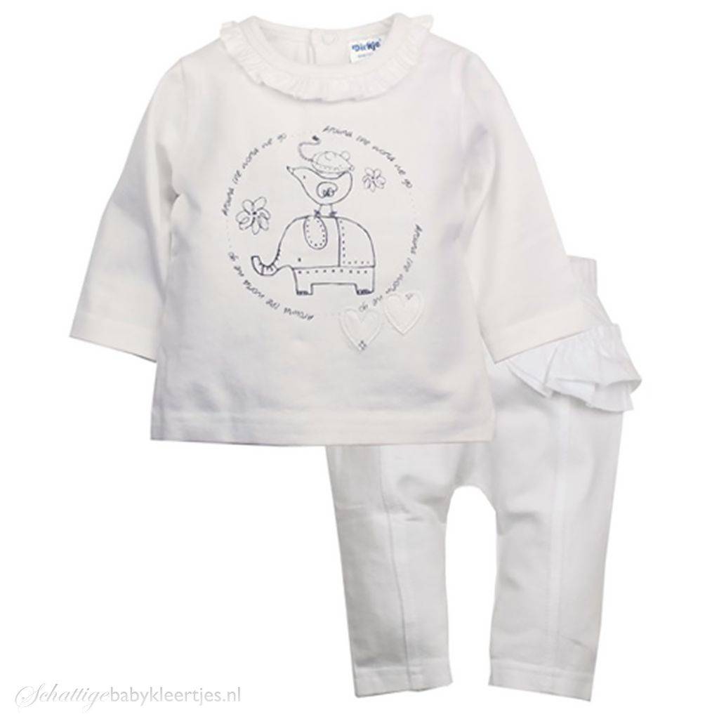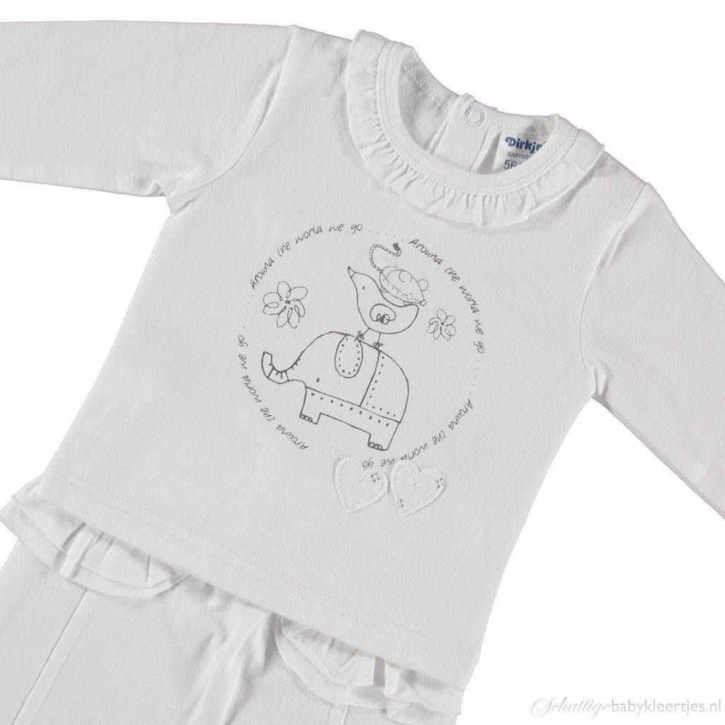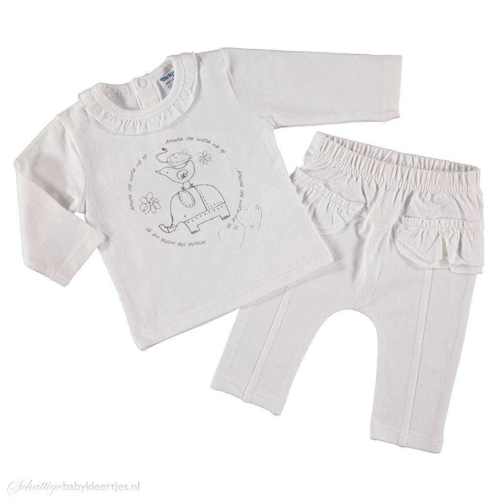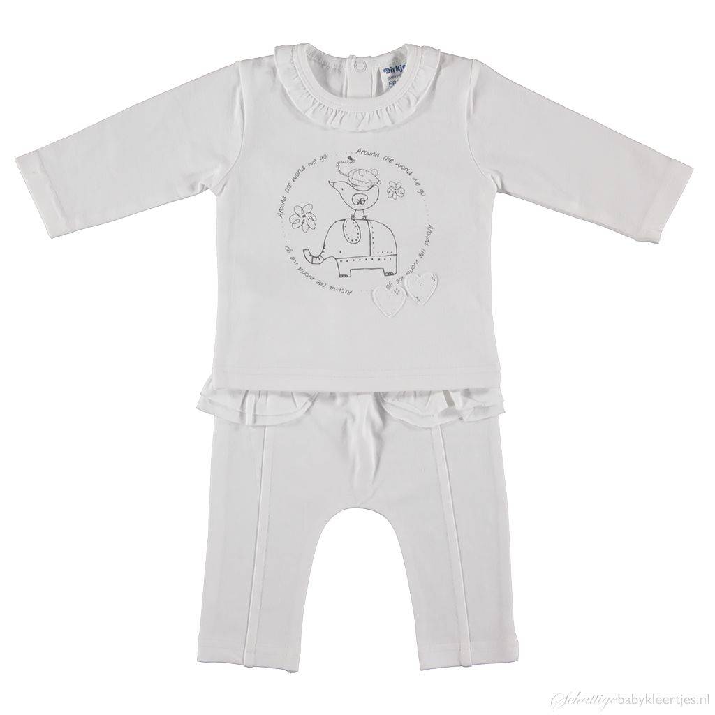 BESCHRIJVINGDit is is een lief setje voor baby meisjes uit de collectie Around the World van Dirkje babykleding. Het setje bestaat uit een longsleeve met print en een bijpassend broekje met veel rouches. De kleurstelling van deze collectie is wit antracietgrijs.