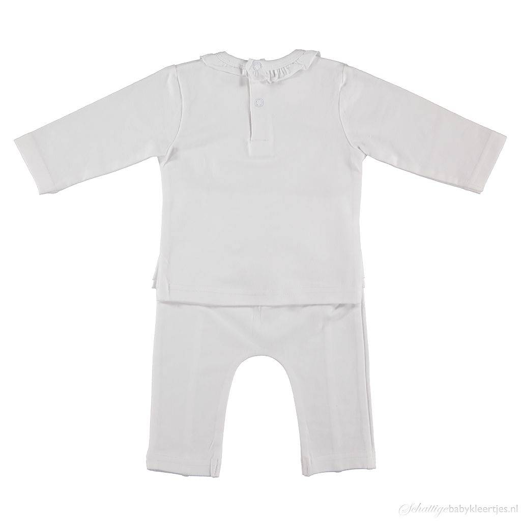 BroekjeBij dit setje hoort een recht broekje in de kleur wit. In het middel zit een comfortabel elastiek. Enkele centrimeters daaronder loopt rondom een siernaad die aan de voorkant voorzien is van twee randen met rouches. Verticaal loopt een siernaad naar de zoom van het broekje.