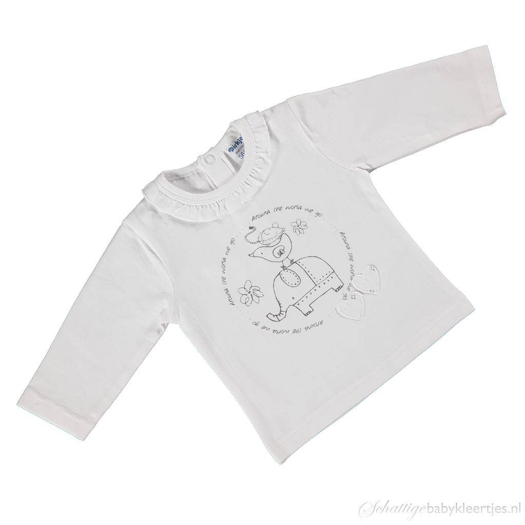 LongsleeveHet shirtje is wit met een glad boordje aan de hals. Rondom de boord zit een witte effen rouche. Op de borst zit een grote antracietkleurige print: een getekend olifantje met een vogeltje en muisje er bovenop, daaromheen de tekst "Around the World We Go....." en bloemtjes. Rechts onderaan de print zitten twee stoffen hartjes met kleine grijze stippeltjes. De longsleeve is effen op de mouwen en rug.