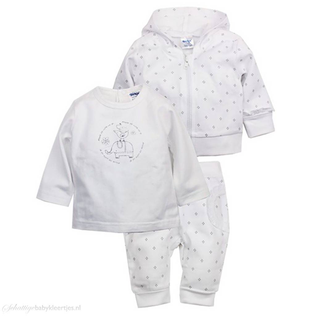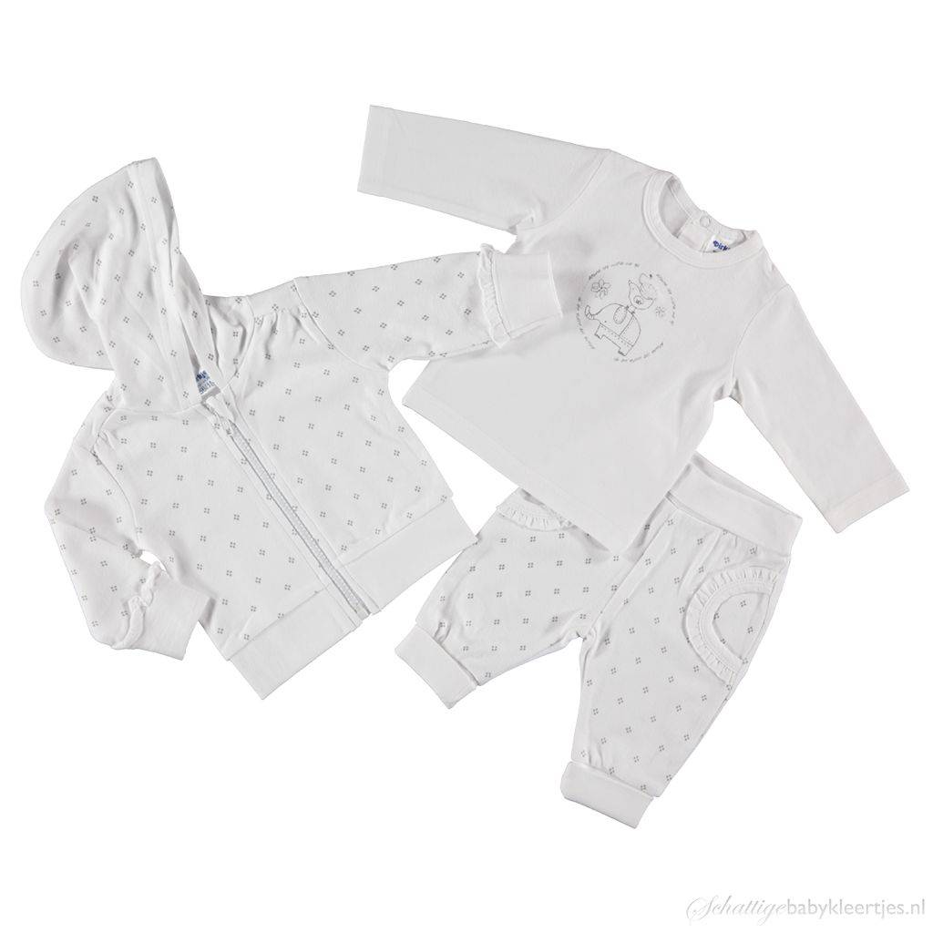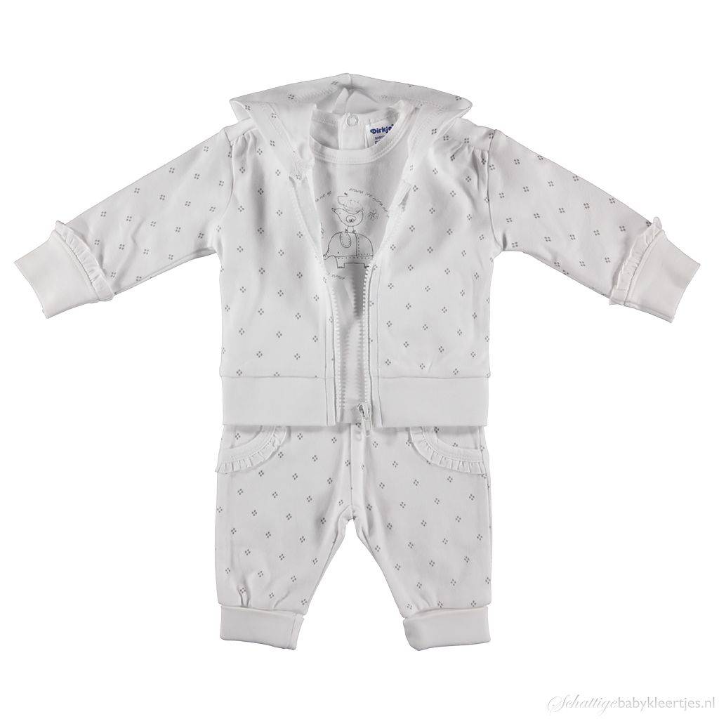 BESCHRIJVINGDit is is een lief setje voor baby meisjes uit de collectie Around the World van Dirkje babykleding. Het setje bestaat uit een longsleeve met print en een bijpassend vestje en broekje met kleine stippeltjes. De kleurstelling van deze collectie is wit antracietgrijs. De longsleeve sluit met twee drukknoopjes op de rug.