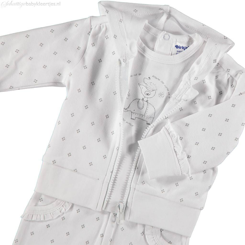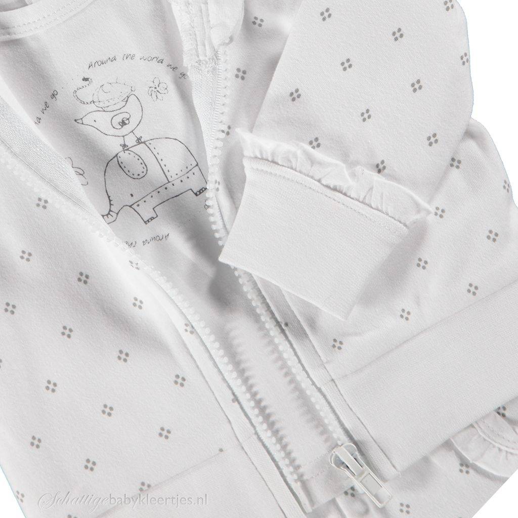 VestjeHet vestje is wit en bezaaid met grijze stippeltjes in ruitvorm gegroepeerd per vier. De mouwtjes en zoom is voorzien van een bredere, witte boord, zodat het vestje netjes blijft zitten. Aan de moiwtjes zit een smalle, witte rouche boven het boordje. Lief detail! Het vest sluit met een witte rits die aan de bovenzijde een beschermhoesje heeft om de kin van uw dochter te beschermen. Het vestje heeft een capuchon van katoen, deze is dun en zit uw kleintje niet in de weg wanneer ze lekker ligt.