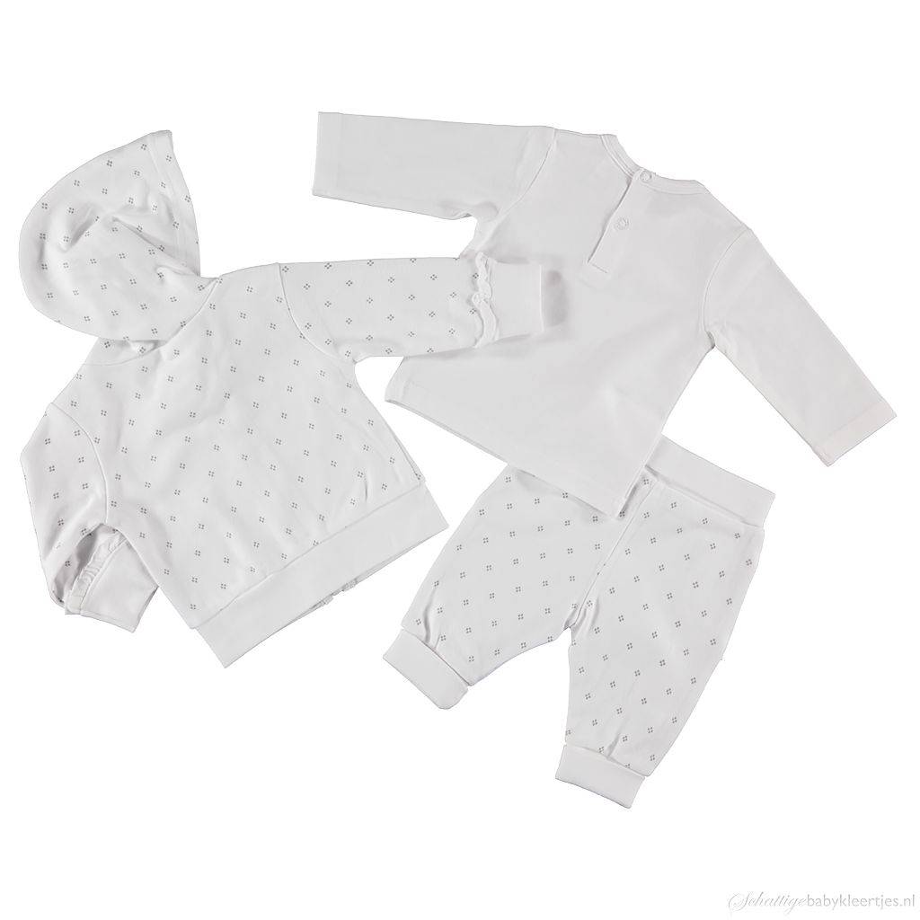 BroekjeBij dit setje hoort een recht broekje in de kleur wit. Ook het broekje is bezaaid met grijze stippeltjes in ruitvorm gegroepeerd per vier. In het middel en aan de broekspijpjes zit een comfortabel, dubbelgeslagen boord met elastiek. Op het broekje zitten ronde (nep)steekzakjes met een glad boordje en een randje met rouches daaromheen.