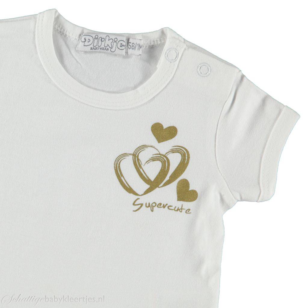 BESCHRIJVINGDit is is een lief en compleet setje voor baby meisjes uit de collectie Supercute van Dirkje babykleding. Het setje bestaat uit een T-shirt,en een bijpassende legging met vast rokje. De kleurstelling van deze collectie is koraal met lichtroze of wit.