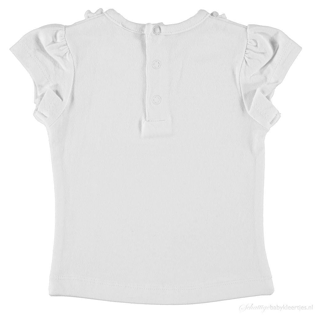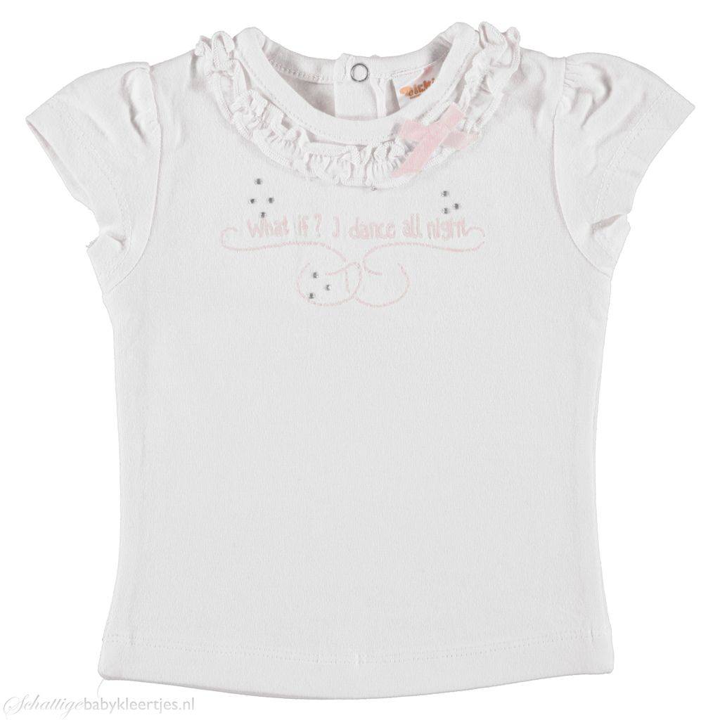 Het t-shirt is wit en heeft een rand rouches van schouder tot schouder langs het boordje aan de hals aan de voorzijde. De korte mouwtjes zijn aangerimpeld op de schouders, waardoor ze lief poffen. Op de voorkant zit lichtroze borduursel: een tekst "What if? I Dance all Night" met krullen eronder. Boven het borduursel zitten zeven kleine glimsteentjes. De mouwtjes en achterzijde van het t-shirt zijn effen wit. Het shirt sluit met drie drukknoopjes op de rug.
