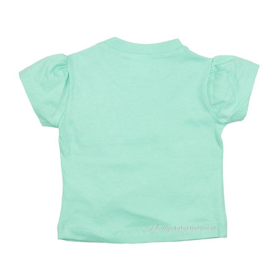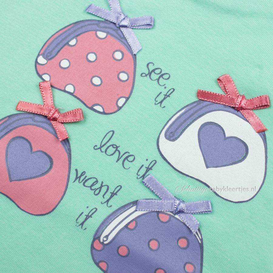 Dit baby t-shirt heeft een zacht, azuurblauw kleurtje. Langs de hals zit een geribbeld boordje. De mouwtjes van het t-shirt zijn op de schouder ligt aangerimpeld, waardoor het mouwtje een beetje poft. Op de voorkant van het t-shirt zit een print van vier portemonneetjes. Eén portemonneetje is roze met mintkleurige stippeltjes en een lila sluiting. op dit portemonneetje zit een lila, satijnen strikje. Het tweede portemonneetje is mintkleurige met een lila hartje en lila sluiting. Hier zit een roze, satijnen strikje op. Het derde portemonneetje is roze met een lila hartje. Op dit portemonneetje zit een roze, satijnen strikje. Het vierde portemonneetje is lila met roze stippeltjes en een mintkleurige sluiting. Er zit een lila, satijnen strikje op. Tussen de portemonneetjes door staat een lila print met de tekst "See it, love it, want it" en de roze print "Fabulous". De achterkant van het shirt en de mouwtjes zijn effen. Dit baby t-shirt sluit met twee drukknoopjes op de rechterschouder.