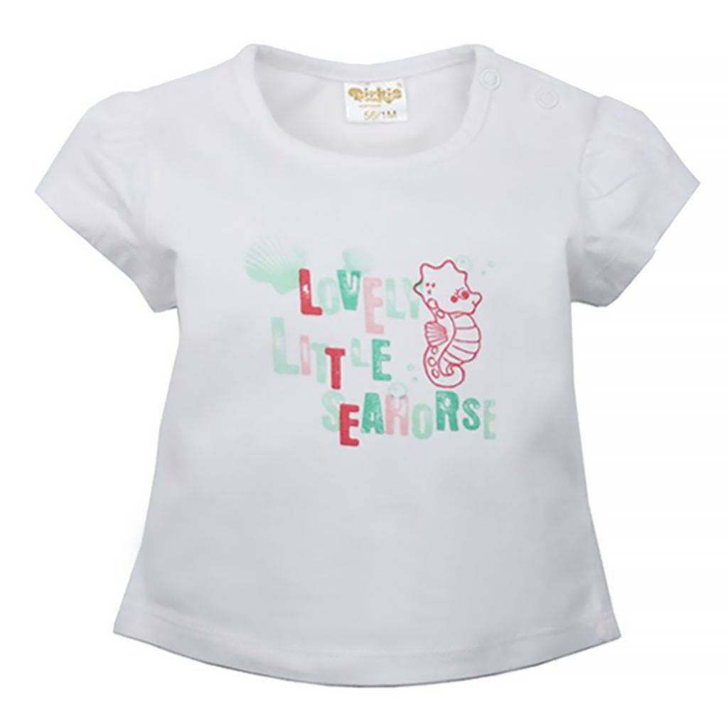 Dit is een schattig, wit zomer t-shirt van katoen en een beetje elastan. Op de borst staat een opvallende print van een roze zeepaardje met de fuchsia, roze, mint en groene tekst "Lovely Little Seahorse" en daaromheen schelpjes en bubbeltjes. De mouwtjes zijn zijn kort en hebben pof door aanrimpeling op de schouder. Het t-shirt is effen wit op de rug en sluit met twee drukknoopjes op de schouders.