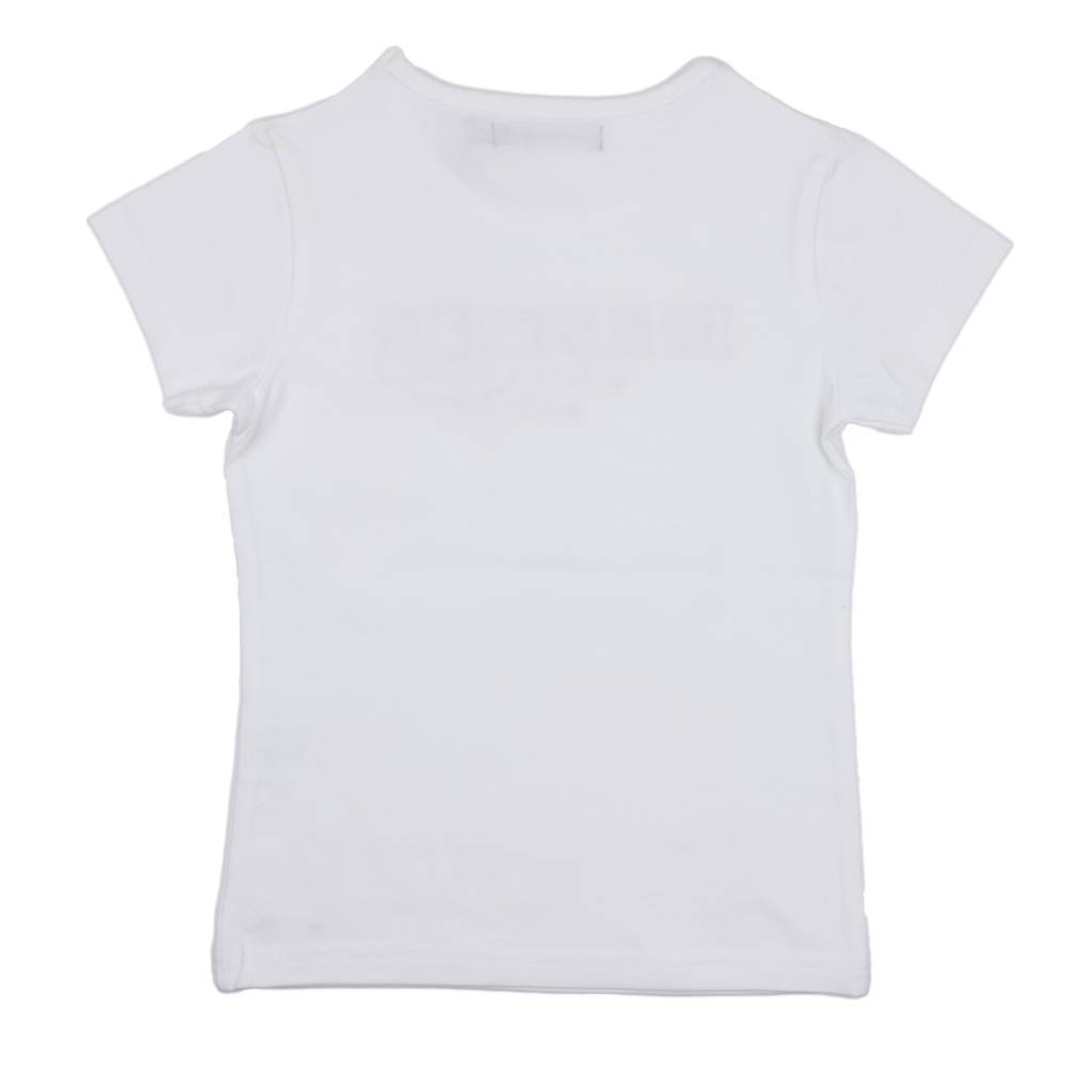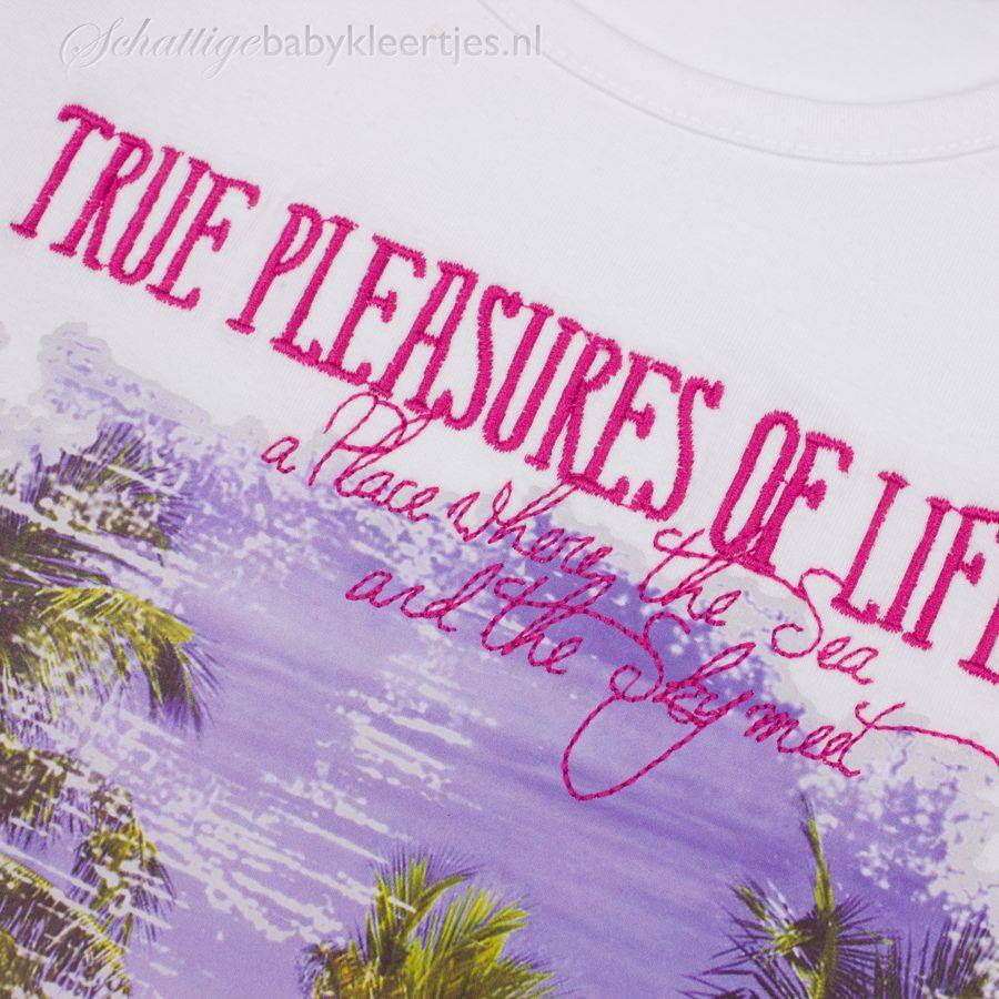 Lief wit t-shirt van Dirkje uit de collectie Pleasures. Het t-shirt heeft een opvallende fotoprint van een strand met palmbomen en een strandhuis op palen met een bijna lila lucht erboven, met twee roze orchideeën op de voorgrond. Boven de fotoprint staat fuchsia geborduurde tekst "True Pleasures of Life, a Place where the Sea and the Sky Meet". Naast de orchideeën staat in witte schrijfletters "Listen to tje Waves, Uncompromised Beauty". Rechts onderaan het t-shirt zit een roze labeltje met "Dirkje". Het ronde halsje heeft een glad boordje. Het t-shirt sluit met twee drukknoopjes op de schouder. De rest van het t-shirt is effen wit van kleur, zonder veel opsmuck. Alle aandacht gaat naar de print op de voorkant, die die aandacht ook echt verdient. Mooi shirt!