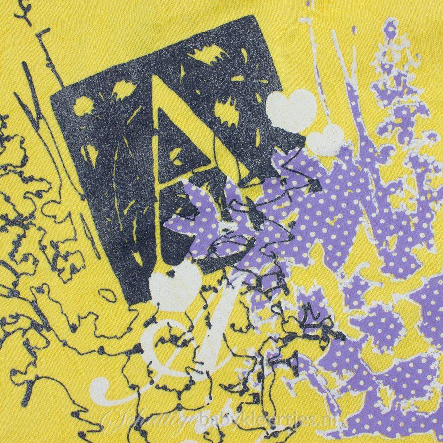 Opvallend geel tshirt van kreukelige stof met een mooie print in wit, paars en donkerblauw met glitter afwerking.