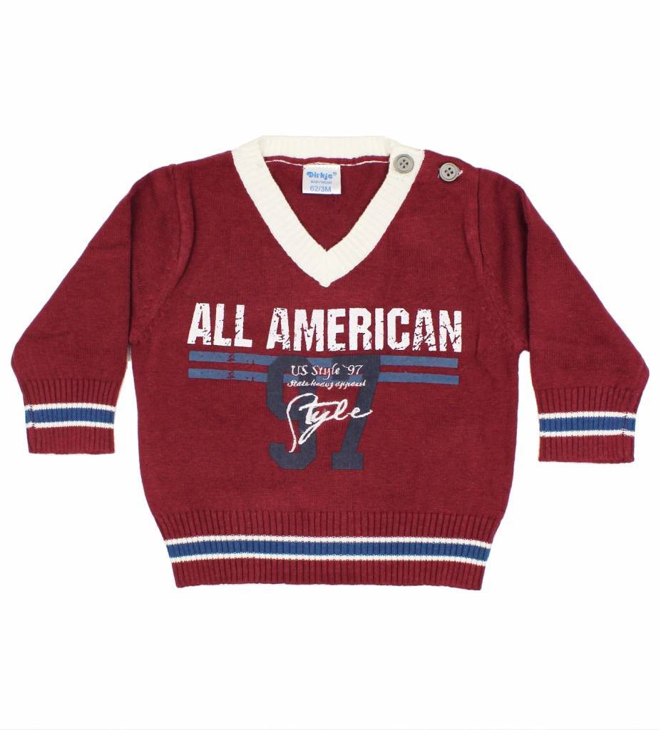 De trui is effen bordeaux met op de borst geborduurde letters en in print (off-white, kobalt en donkerblauw). Aan de onderzijde en mouwen van de trui zit een brede geribbelde boord waar één bredere blauwe en twee smallere off-white strepen op zitten. Het off-white geribbelde boordje aan de hals loopt in een V-nek. De achterzijde van de trui is effen bordeaux. De trui sluit met twee knoopjes op de schouder (alleen bij de kleine maatjes).