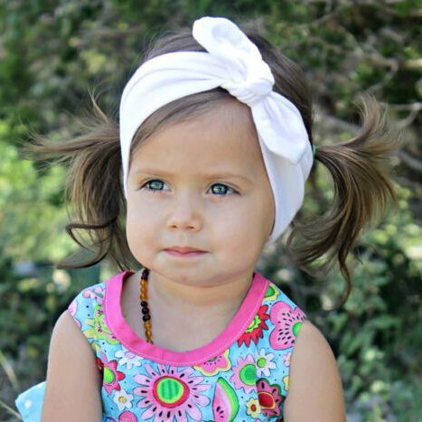 - Het bandje is wit en is gemaakt van rekbare stof en geschikt voor baby en meisje tot ca 8 jaar. De band is 40 cm rond en 7 cm breed. aan de achterkant. Aan de voorkant loopt de band smal toe naar een knoop.