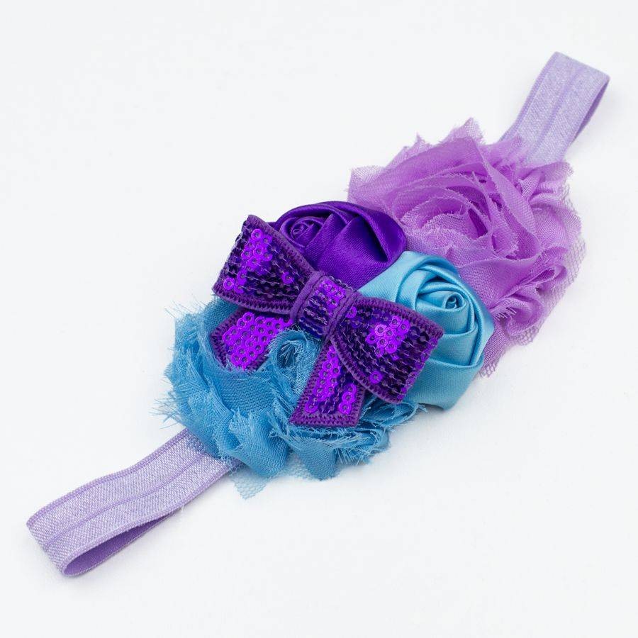 - Het cluster aan bloemen is is 11 cm lang over het bandje heen en max 6 cm breed. Het bestaat uit een lila shabby bloem, twee satijnen roosjes (blauw en paars) en een blauwe shabby bloem. Op de blauwe shabby bloem is een paarse glitter strik bevestigd.