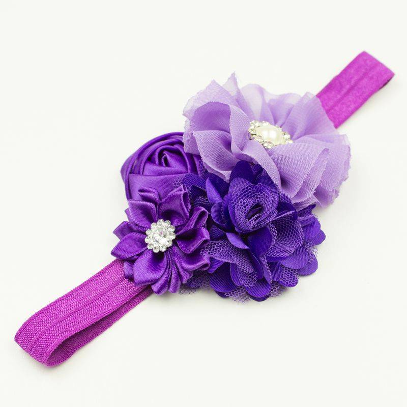 Baby haarbandje bloemen chiffon/satijn/strass (donkerpaars)