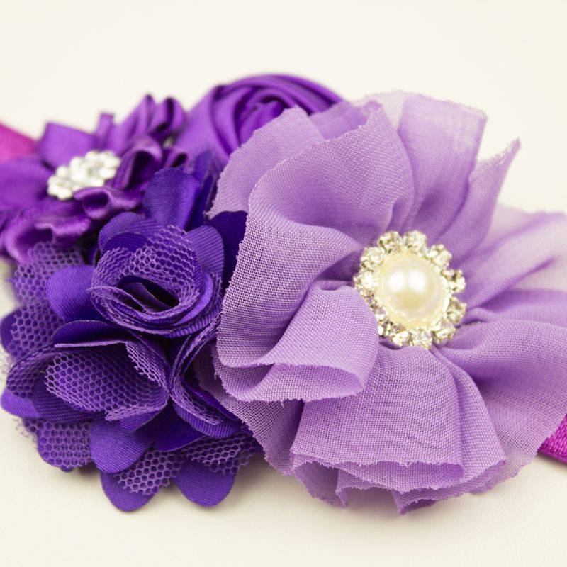 - Op dit bandje zitten vier bloemen. Eén bloem met fijne bloemblaadjes is van satijn met een strass steentje in het hart van de bloem. Daarnaast zitten een satijnen roosje en een chiffon bloemetje met voile. De grootste bloem is iets lichter paars en heeft een parel met strass steentjes eromheen in het hart.