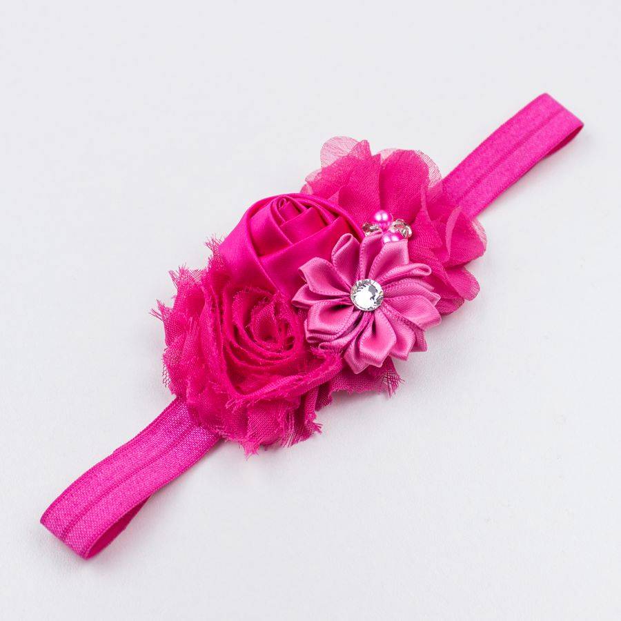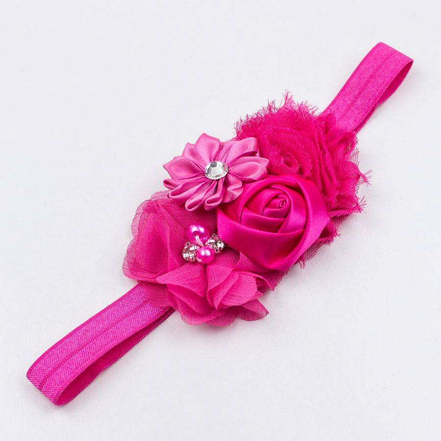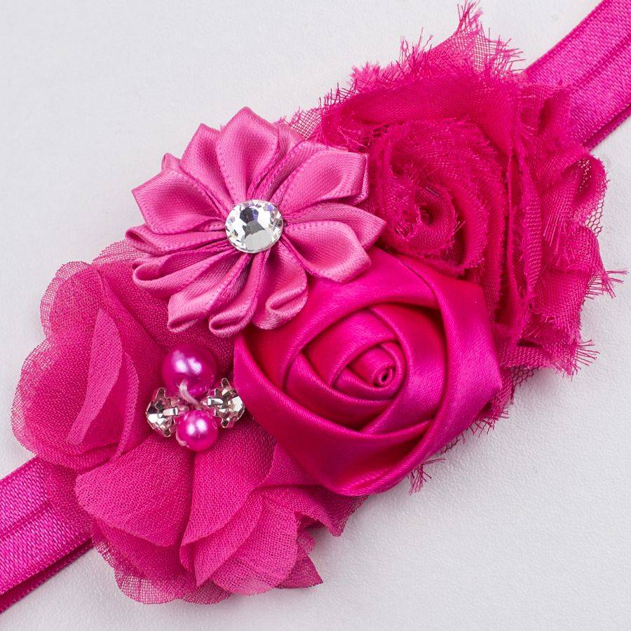- Schattig haarbandje voor een baby met vier bloemen, shabby, chiffon en satijn, met strass in fuchsia.