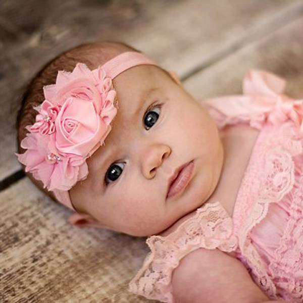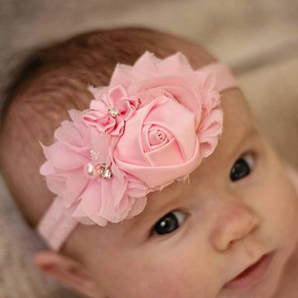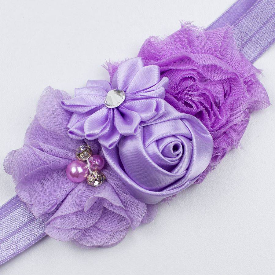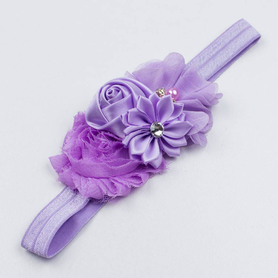 - Schattig haarbandje voor een baby met vier bloemen, shabby, chiffon en satijn, met strass in lila.