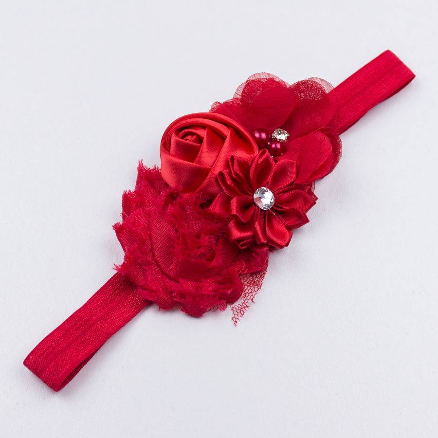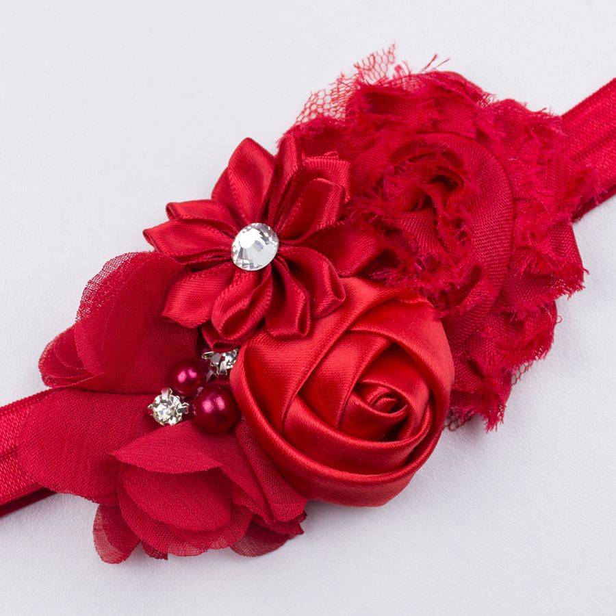 - Schattig haarbandje voor een baby met vier bloemen, shabby, chiffon en satijn, met strass in rood.