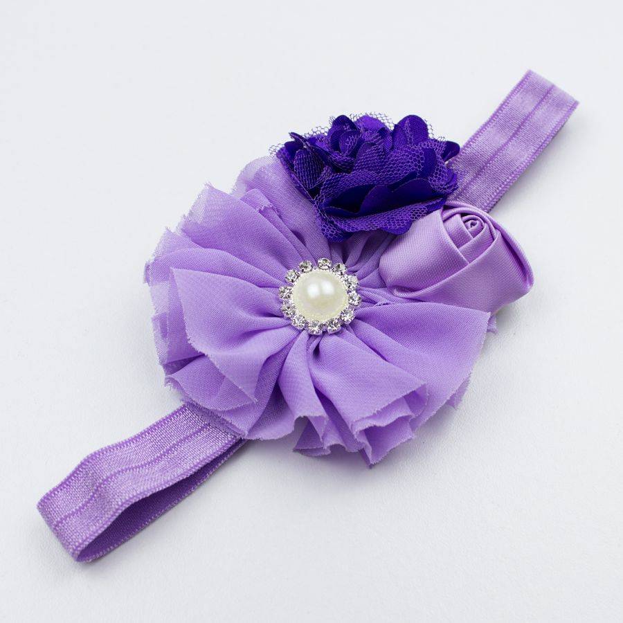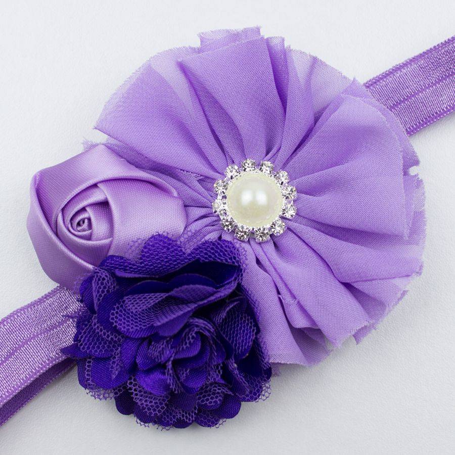- Op dit haarbandje zitten drie verschillende bloemen: een grote bloem van lila organza, een bloem van paars tule en een lila, satijnen roosje. Op de grote bloem zit een applicatie van een parel met strass eromheen. Dit is een heel opvallend haarbandje dat uw dochter mooi zal staan!
