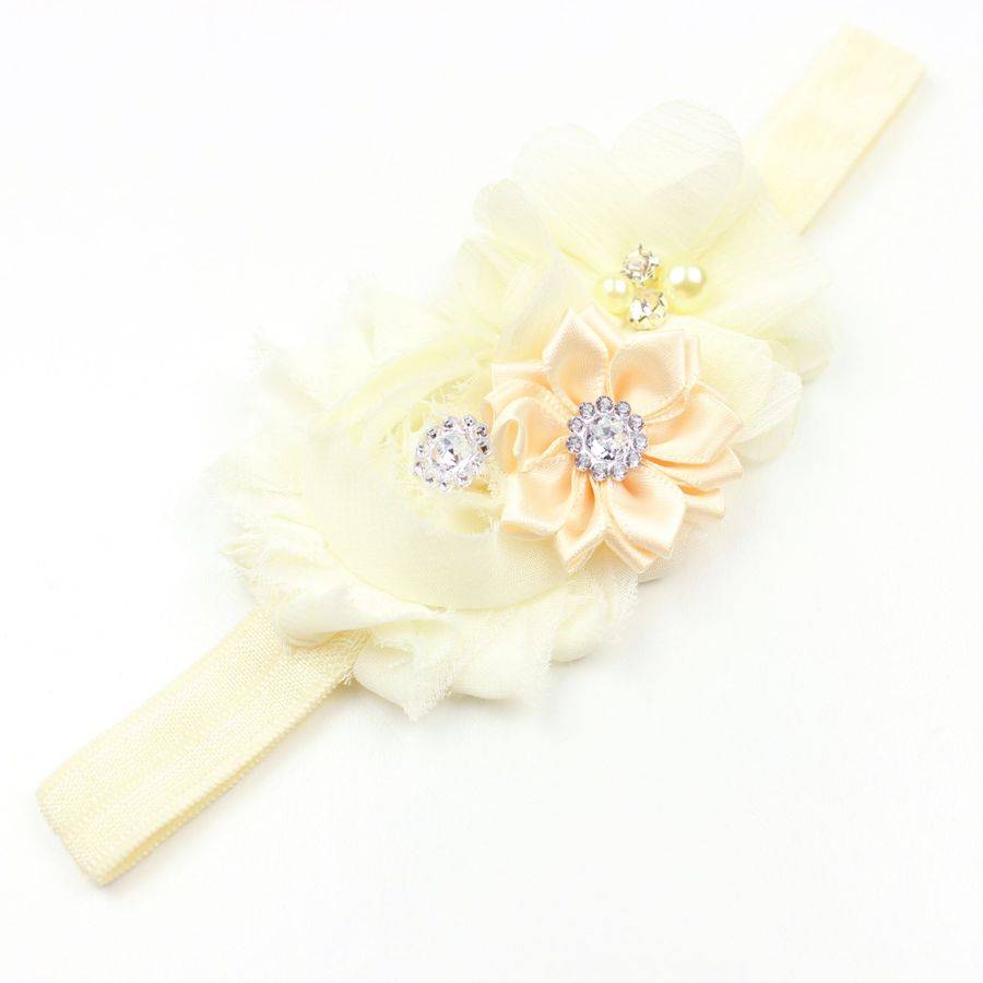 - Op dit bandje zitten drie bloemen. Eén bloem is shabby met een strass steentje in het hart van de bloem. De tweede bloem is van chiffon met twee strass steentjes en twee gekleurde parels in het hart. De derde bloem is kleiner en zit half over de twee andere bloemen, satijn met fijne bloemblaadjes en in hart een strass steentje.
