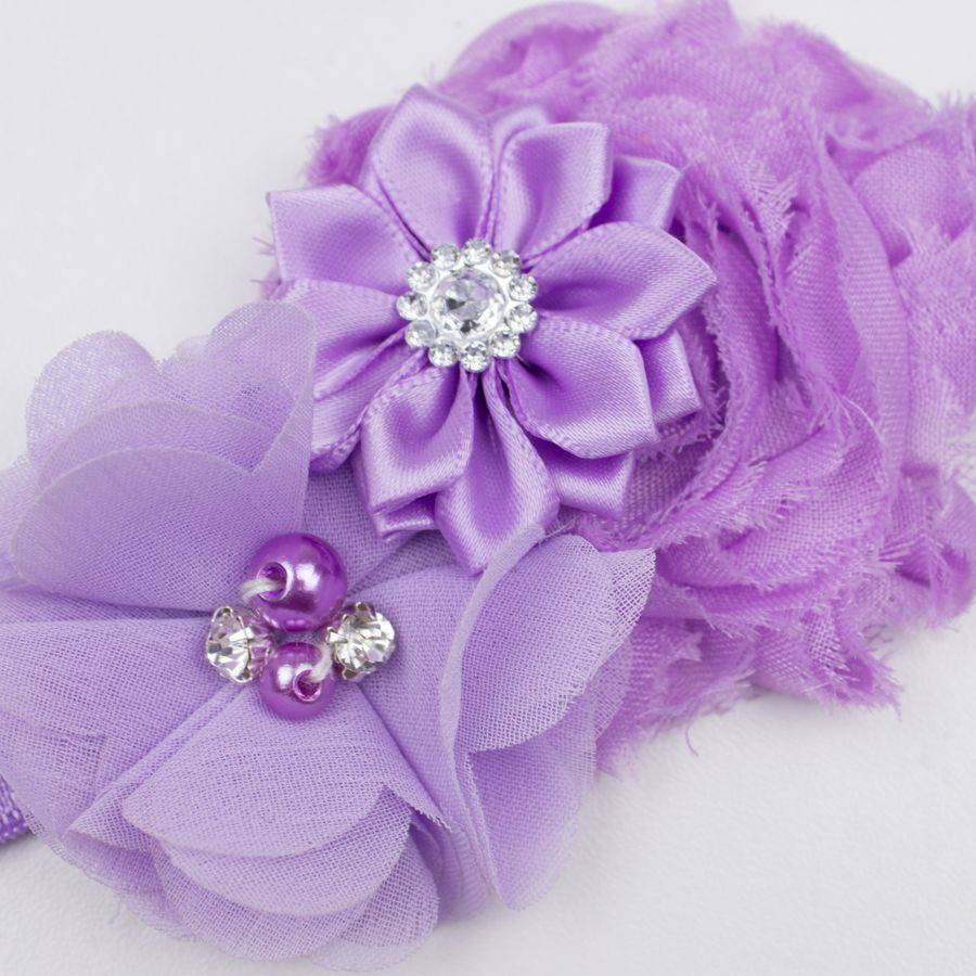 - Op dit bandje zitten drie lila bloemen. Eén bloem is shabby met een strass steentje in het hart van de bloem. De tweede bloem is van chiffon met twee strass steentjes en twee gekleurde parels in het hart. De kleinste bloem zit half over de twee andere bloemen, is van satijn met fijne bloemblaadjes en in hart een strass steentje.