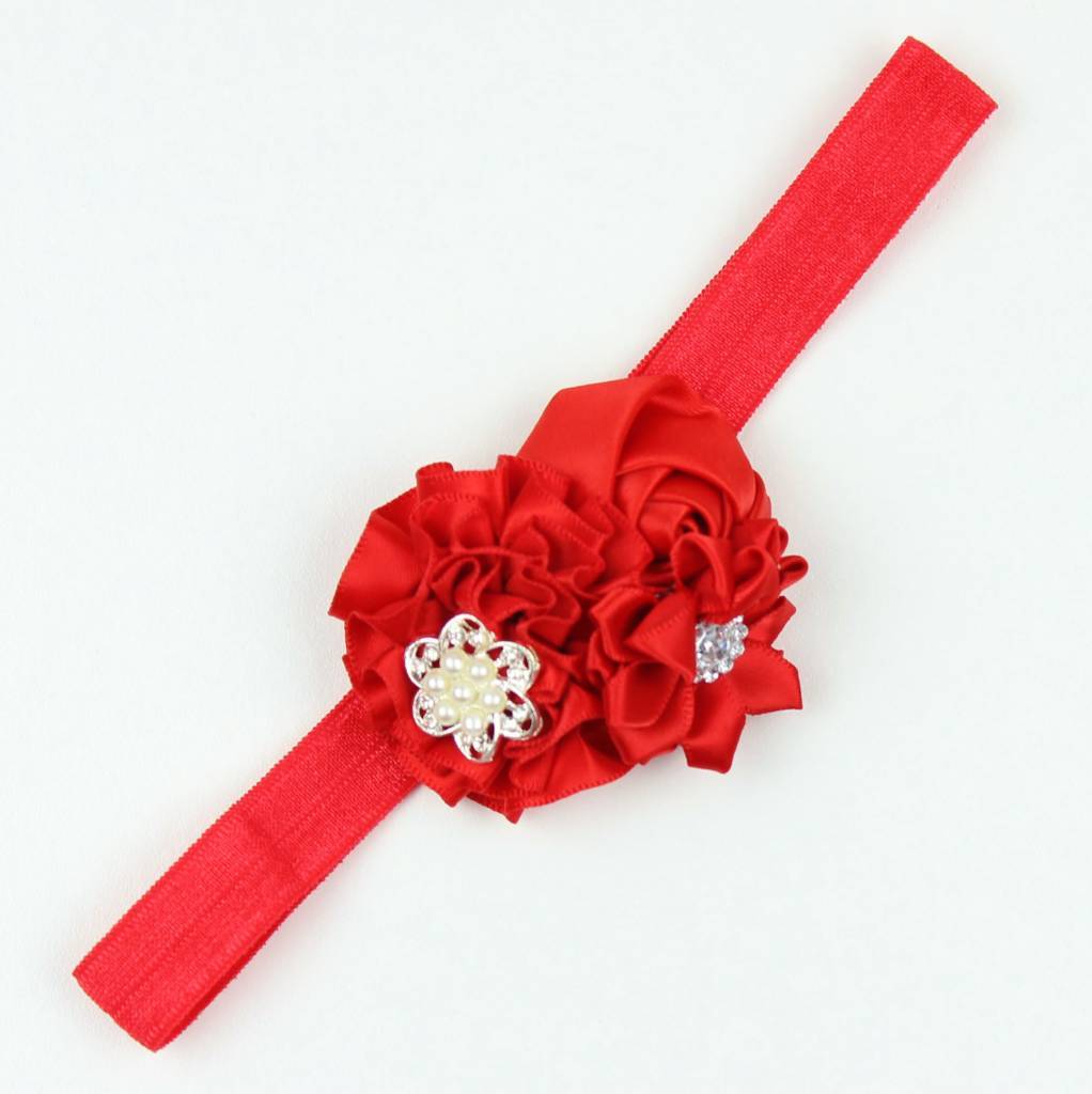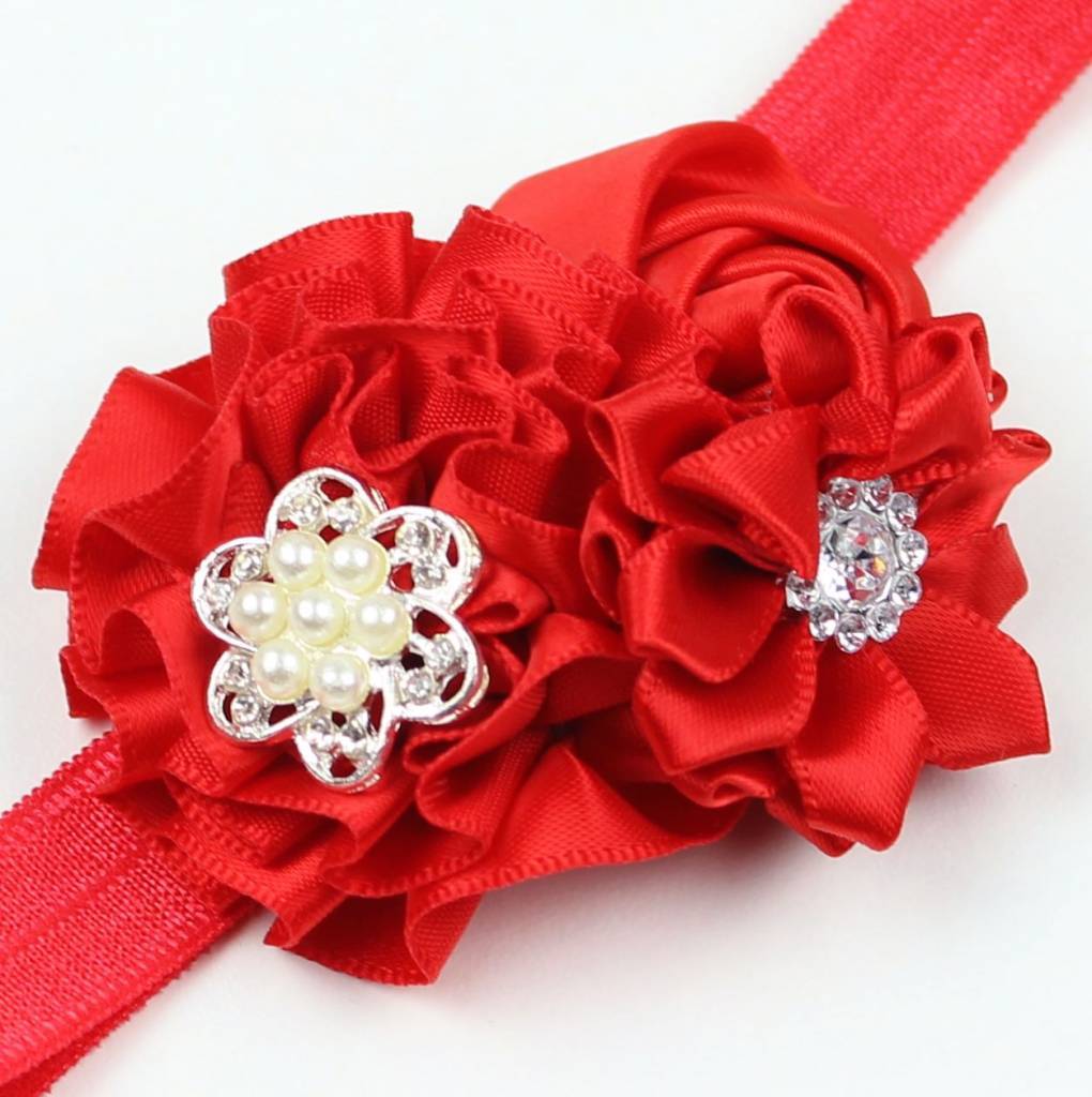 - Prachtig haarbandje met drie rode bloemen op een rood haarbandje.
