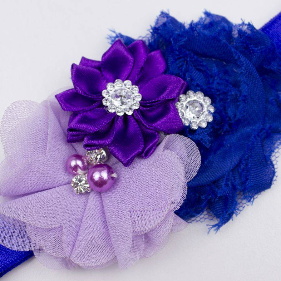 - Op dit bandje zitten drie bloemen. Eén blauwe bloem is shabby met een strass steentje in het hart van de bloem. De tweede lila bloem is van chiffon met twee strass steentjes en twee gekleurde parels in het hart. De kleinste paarse bloem zit half over de twee andere bloemen, is van satijn met fijne bloemblaadjes en in hart een strass steentje.
