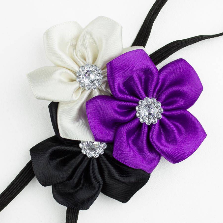 - Op het smalle bandje zitten drie bloemen, gemaakt van satijn. Eén bloem is zwart, eentje dieppaars en eentje wit. In het hart van iedere bloem zit een strass steen.