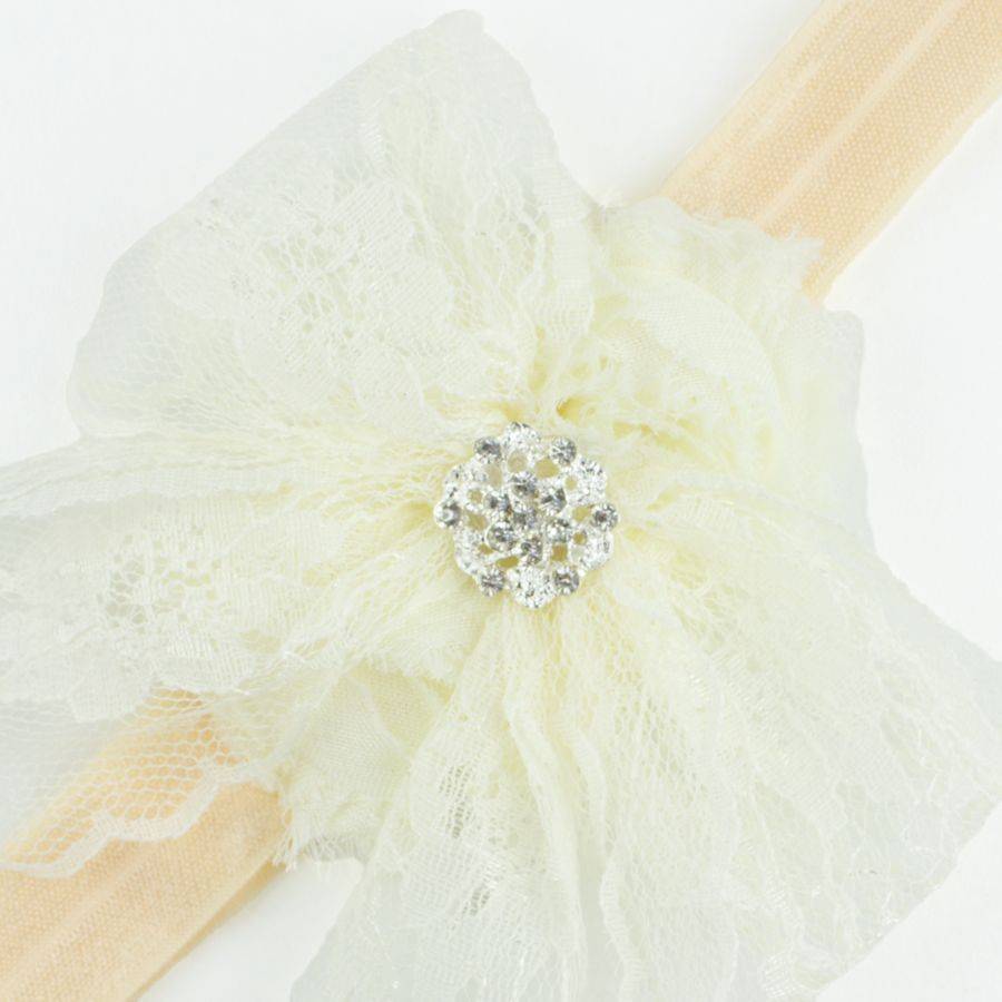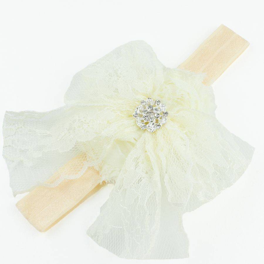 - Dit is een prachtig haarbandje met een kanten strik, een grote strass applicatie op twee shabby bloemen.