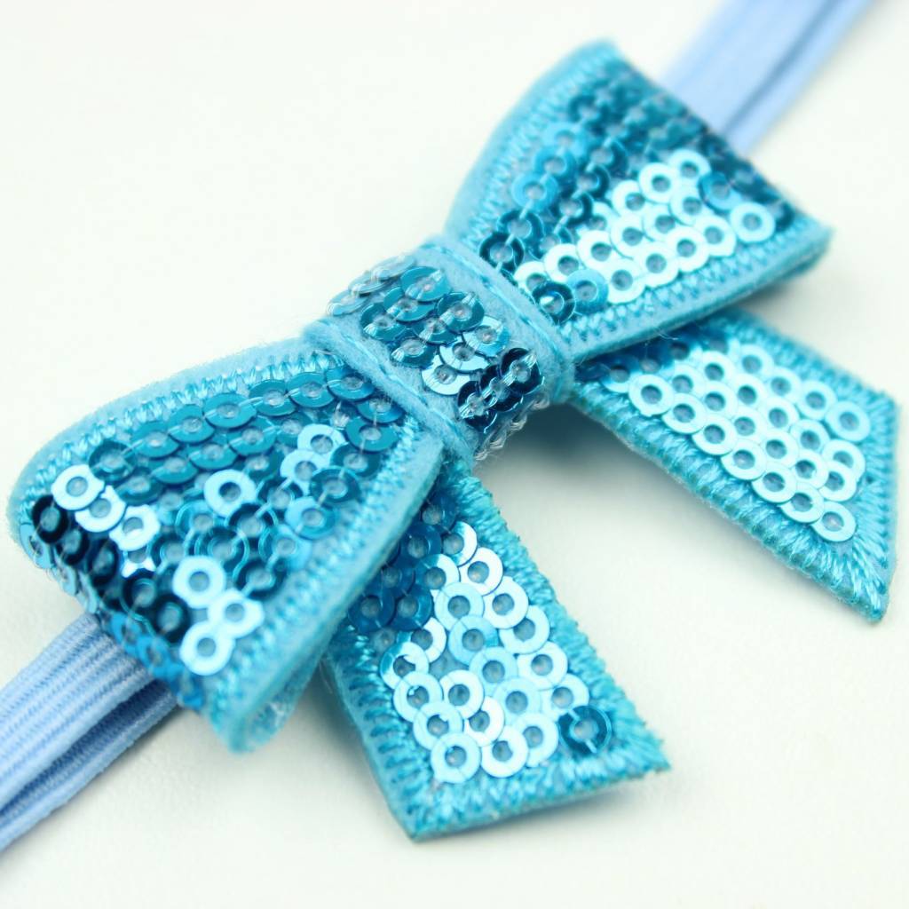 - Kleine blauwe strik op een smal, blauw haarbandje.