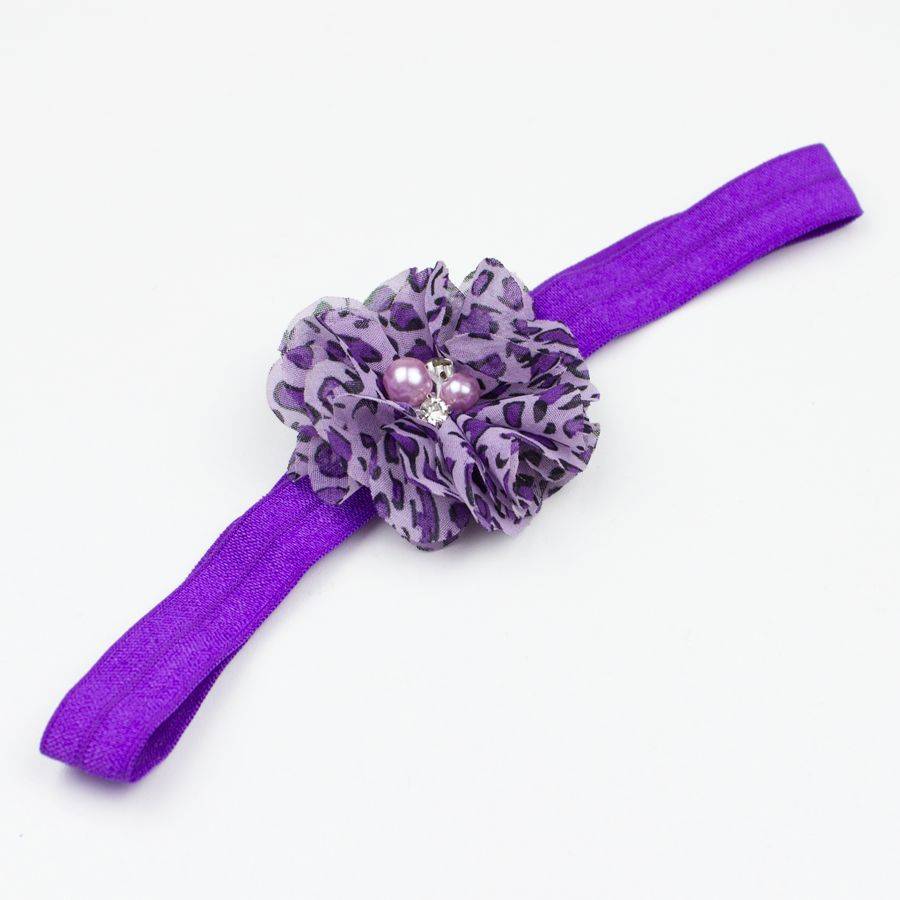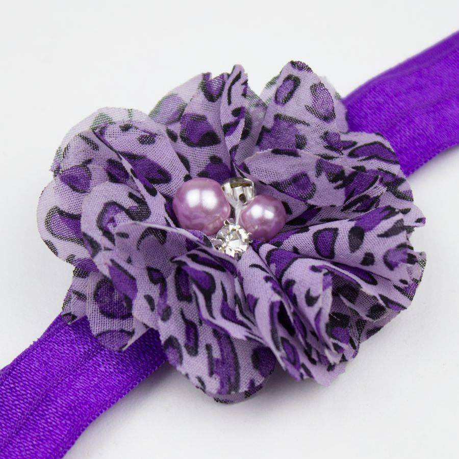 - Opvallend haarbandje met een bloem met luipaardvlekken in lila, paars en antraciet. De bloem bestaat uit meerdere lagen. In het hart van de bloem zitten twee lila pareltjes en twee strass steentjes. Het haarbandje is paars.