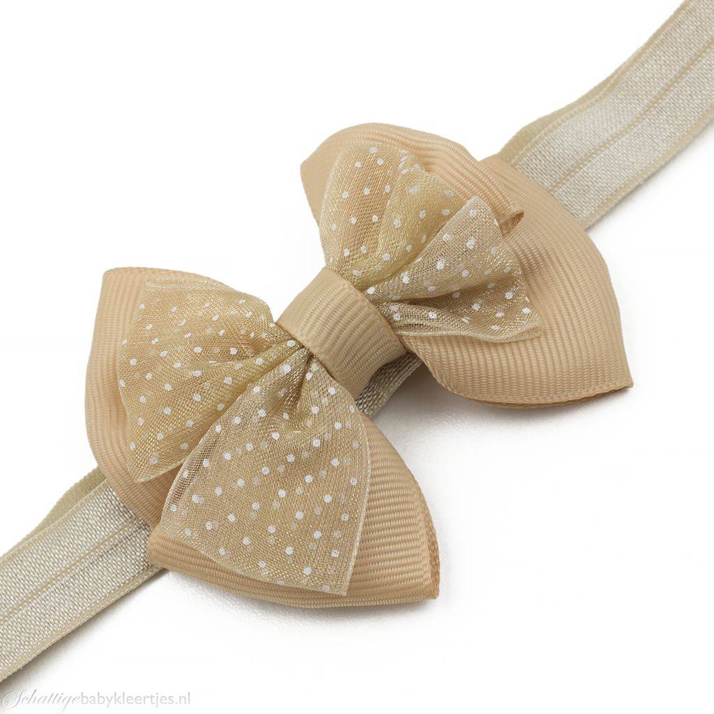 - Op het haarbandje zit een strik van effen zandkleurige stof met daarop een iets kleiner stikje van chiffon in zand met witte stippeltjes. De knoop van de strik is weer effen zand.