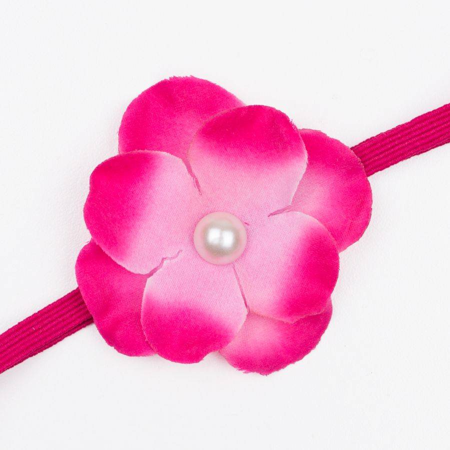- Op het bandje zit een hortensia bloemetje, gemaakt van twee lagen delicate bloemblaadjes. De bloem is veelkleurig: roze aan de binnenkant en naar de buitenkant toe loopt het over naar fuchsia. In het hart van het bloemetje zit een halve parel.