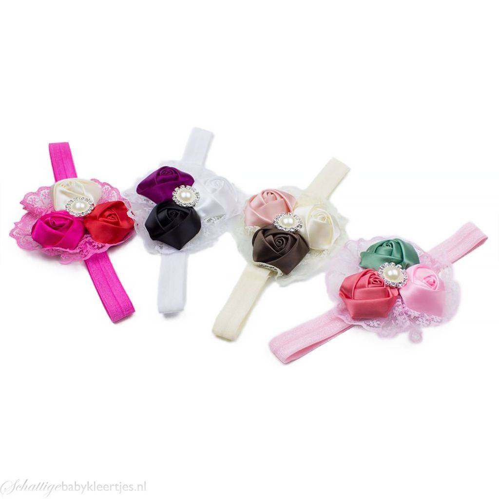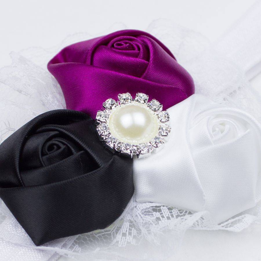 - Op het bandje zitten drie satijnen rozen in aubergine, zwart en wit. Midden op deze drie bloemen zit een parelapplicatie met kleine strass steentjes rondom. De bloemen zijn bevestigd op een stukje wit kant.