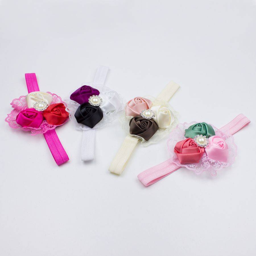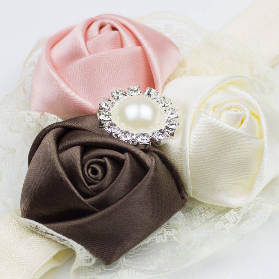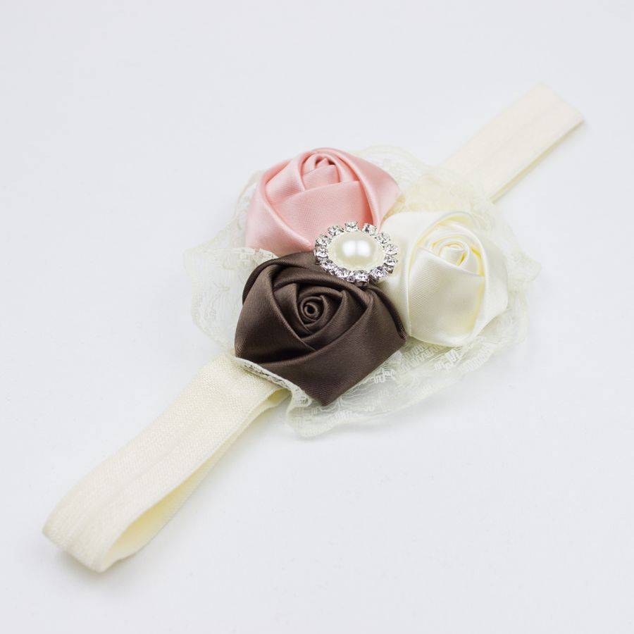 - Op het bandje zitten drie satijnen rozen in bruin, oudroze en ivoor. Midden op deze drie bloemen zit een parelapplicatie met kleine strass steentjes rondom. De bloemen zijn bevestigd op een stukje ivoorkleurig kant.