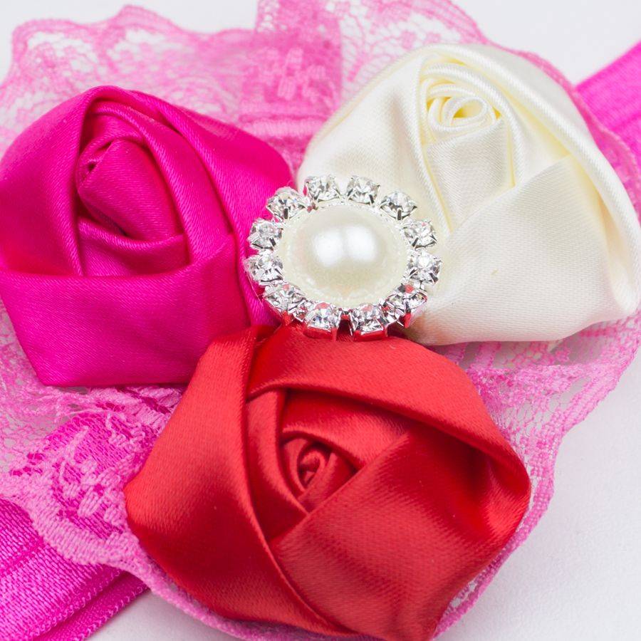 - Op het bandje zitten drie satijnen rozen in fuchsia, rood en ivoor. Midden op deze drie bloemen zit een parelapplicatie met kleine strass steentjes rondom. De bloemen zijn bevestigd op een stukje fuchsia kant.