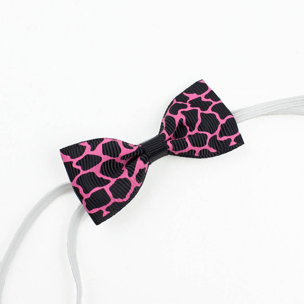 - Op het bandje is een klein strikje bevestigd. Het is een fuchsia strikje met zwarte luipaard vlekjes. Het Het strikje is 5 cm bij 2 cm, echt klein dus.