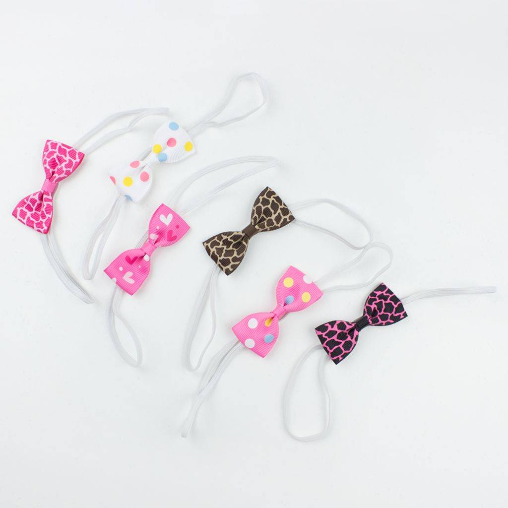 - Op het bandje is een klein strikje bevestigd. Het is een roze strikje met stippeltjes in de kleuren wit, geel en lichtblauw. Het Het strikje is 5 cm bij 2 cm, echt klein dus.