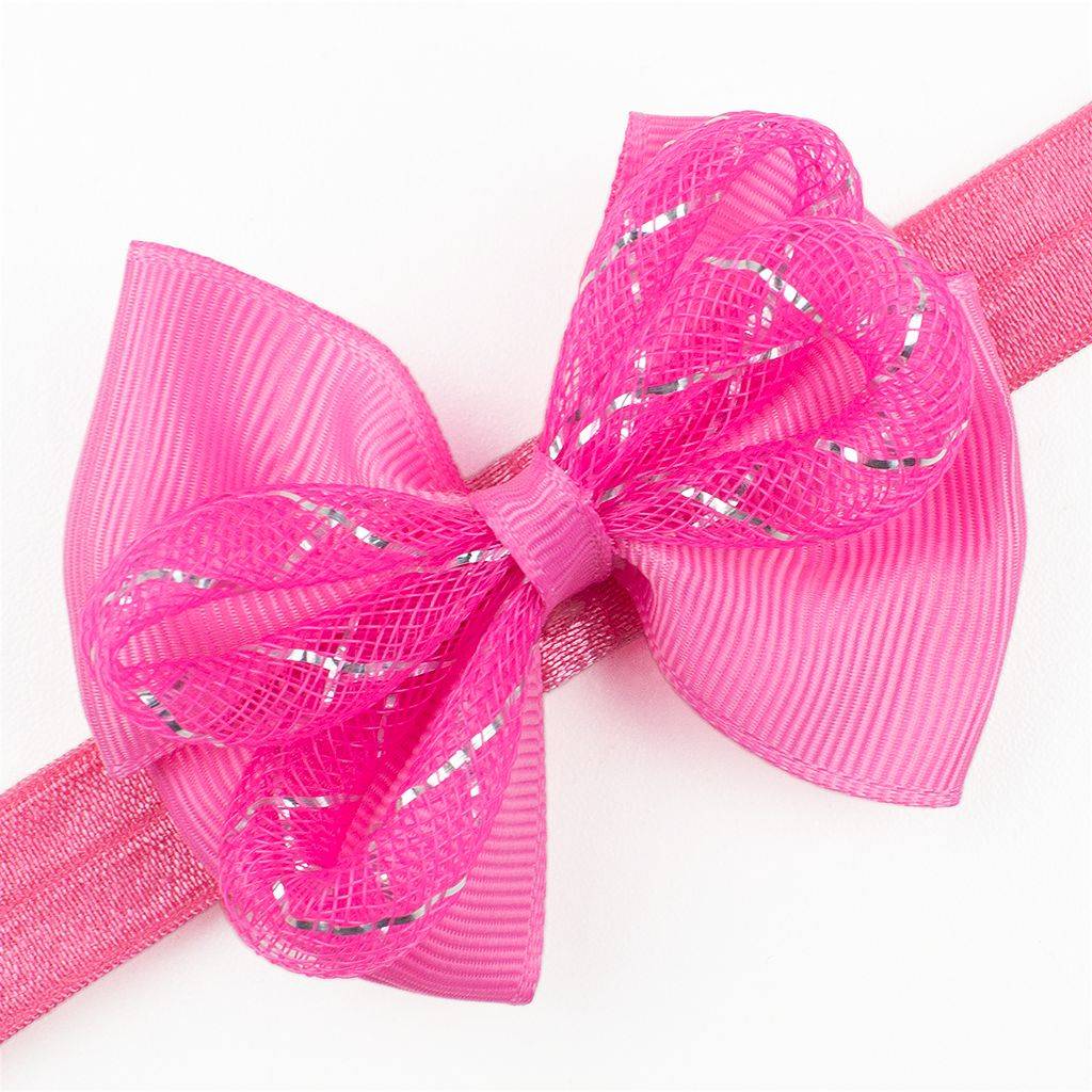 - Op het bandje is een strik bevestigd. Het is een effen roze strik van 7 bij 5,5 cm. Bovenop deze strik zit een tweede strik. Deze is rond, gemaakt van een gaas-stof en met een zilveren glitterdraad erdoor heen gemaakt.