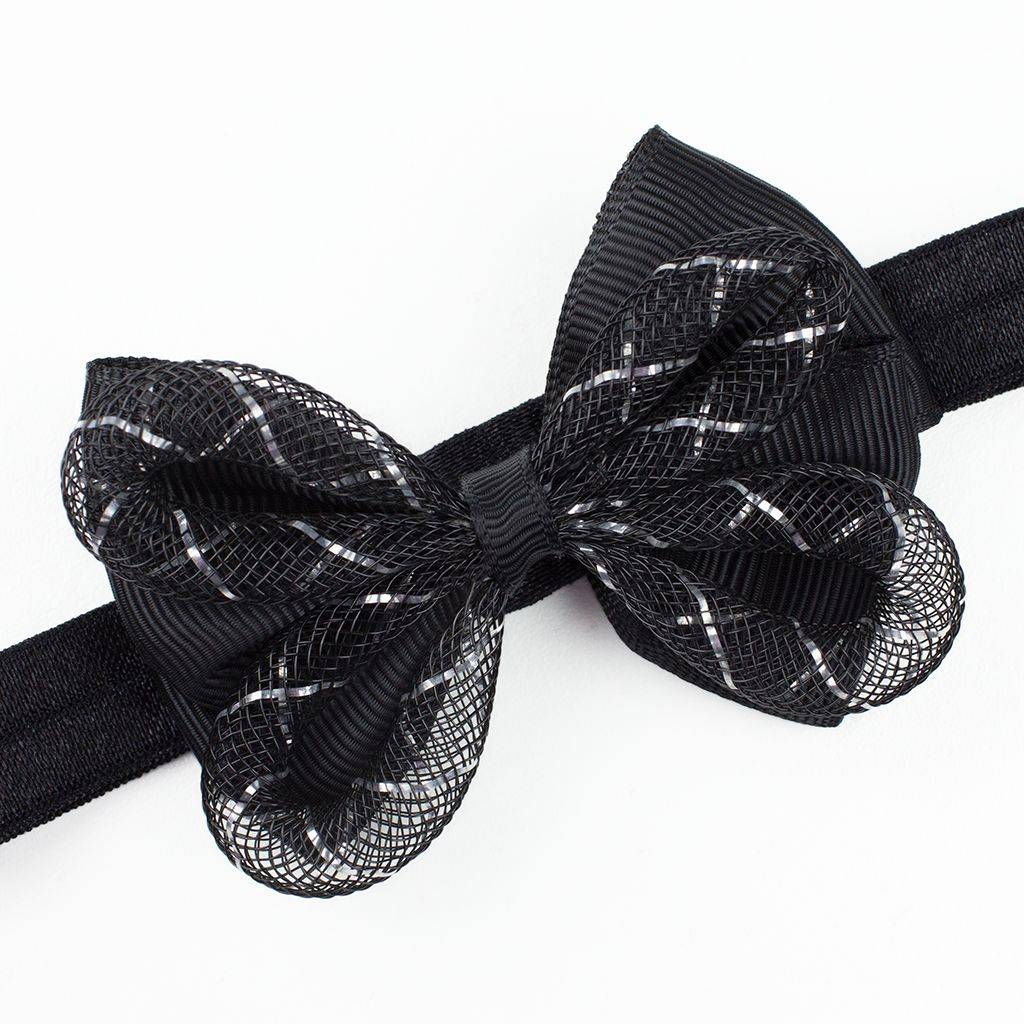 - Op het bandje is een strik bevestigd. Het is een effen lzwarte strik van 7 bij 5,5 cm. Bovenop deze strik zit een tweede strik. Deze is rond, gemaakt van een gaas-stof en met een zilveren glitterdraad erdoor heen gemaakt.